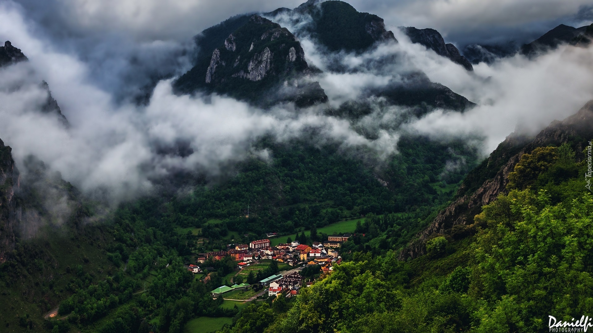 Edytor tapety: La Pola Somiedo w zamglonych górach w Asturii