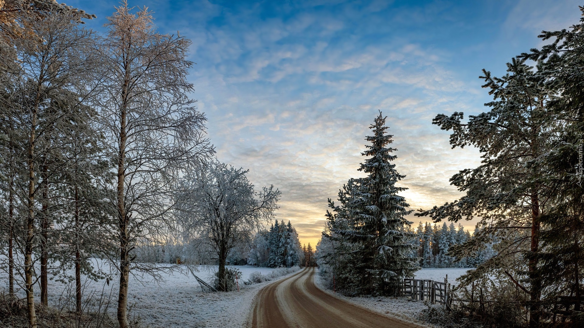 Edytor tapety: Ośnieżone pole i drzewa przy drodze