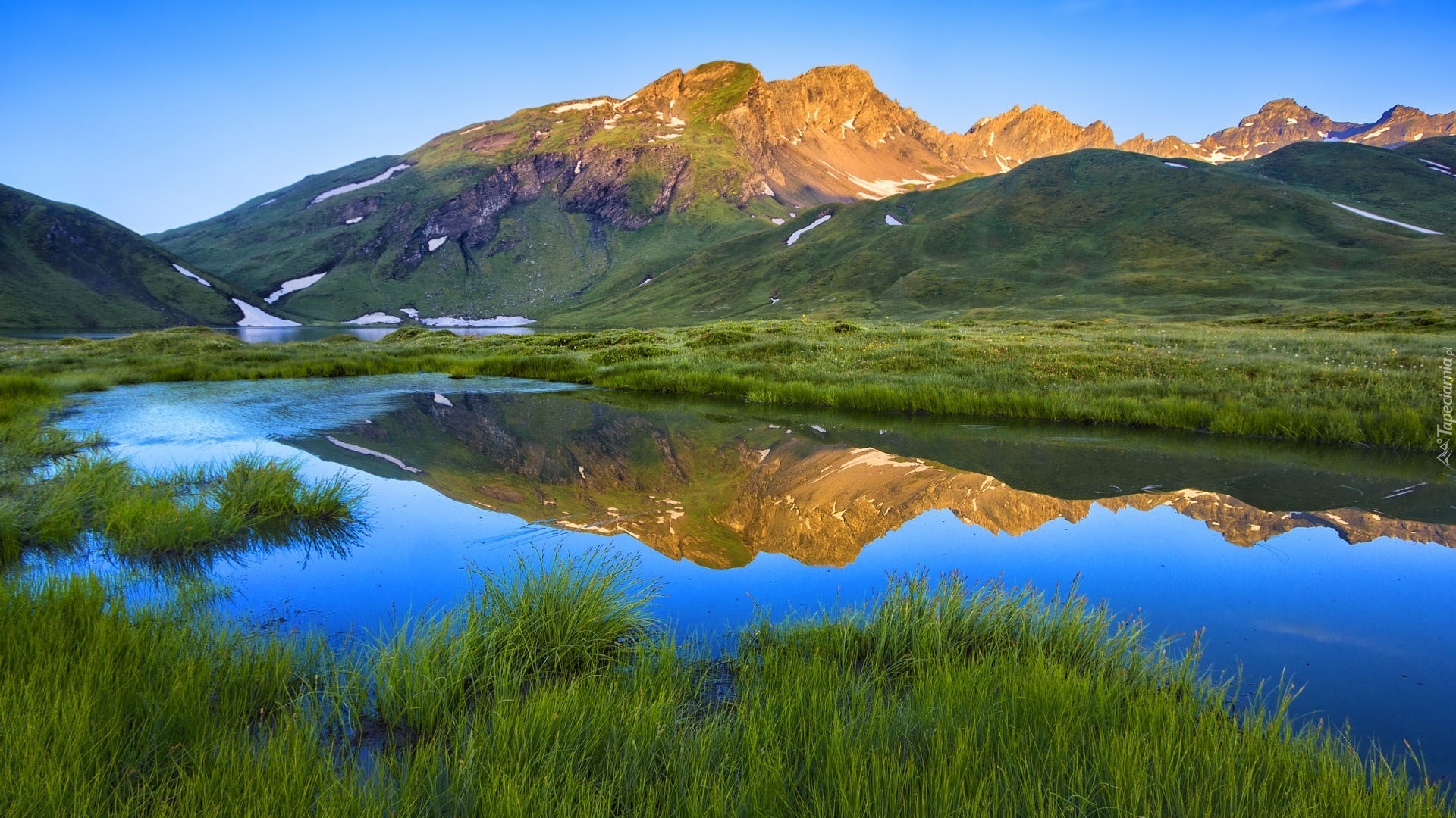 Edytor tapety: Trawy i odbicie gór w jeziorze Verney Lake
