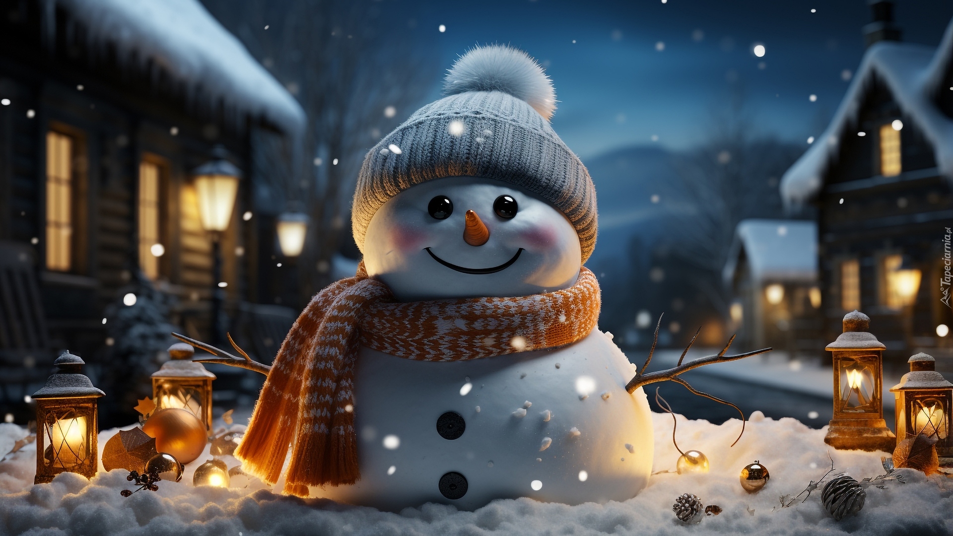 Edytor tapety: Bałwanek w czapce przy oświetlonych domach i lampionach