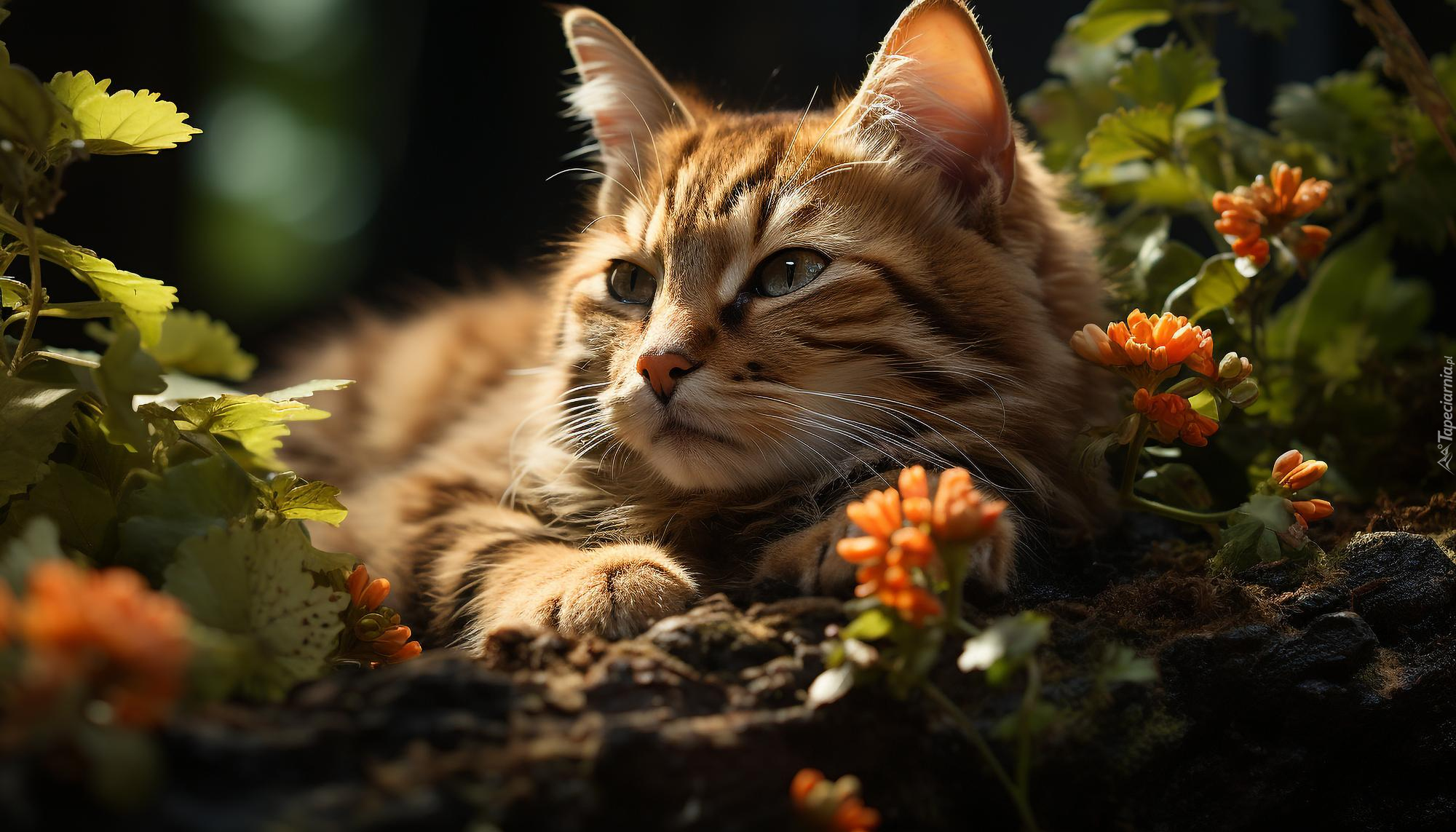 Edytor tapety: Leżący kot wśród roślin