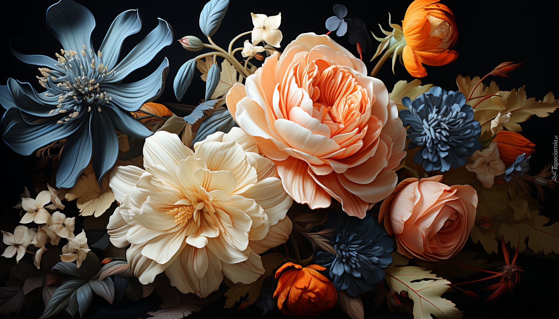 Edytor tapety: Różne kolorowe kwiaty i liście na czarnym tle