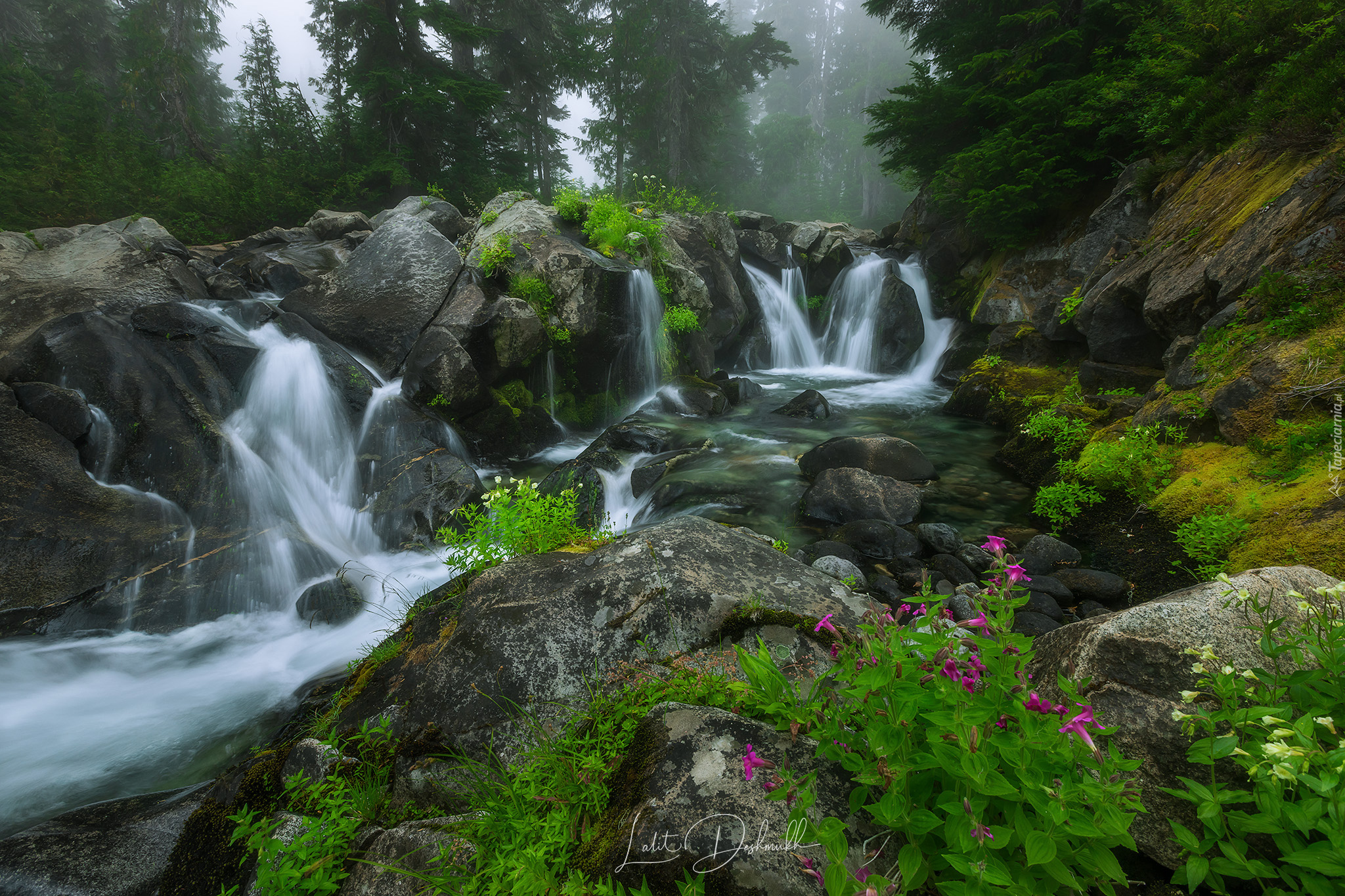 Edytor tapety: Kwiaty i drzewa na skałach przy rzece