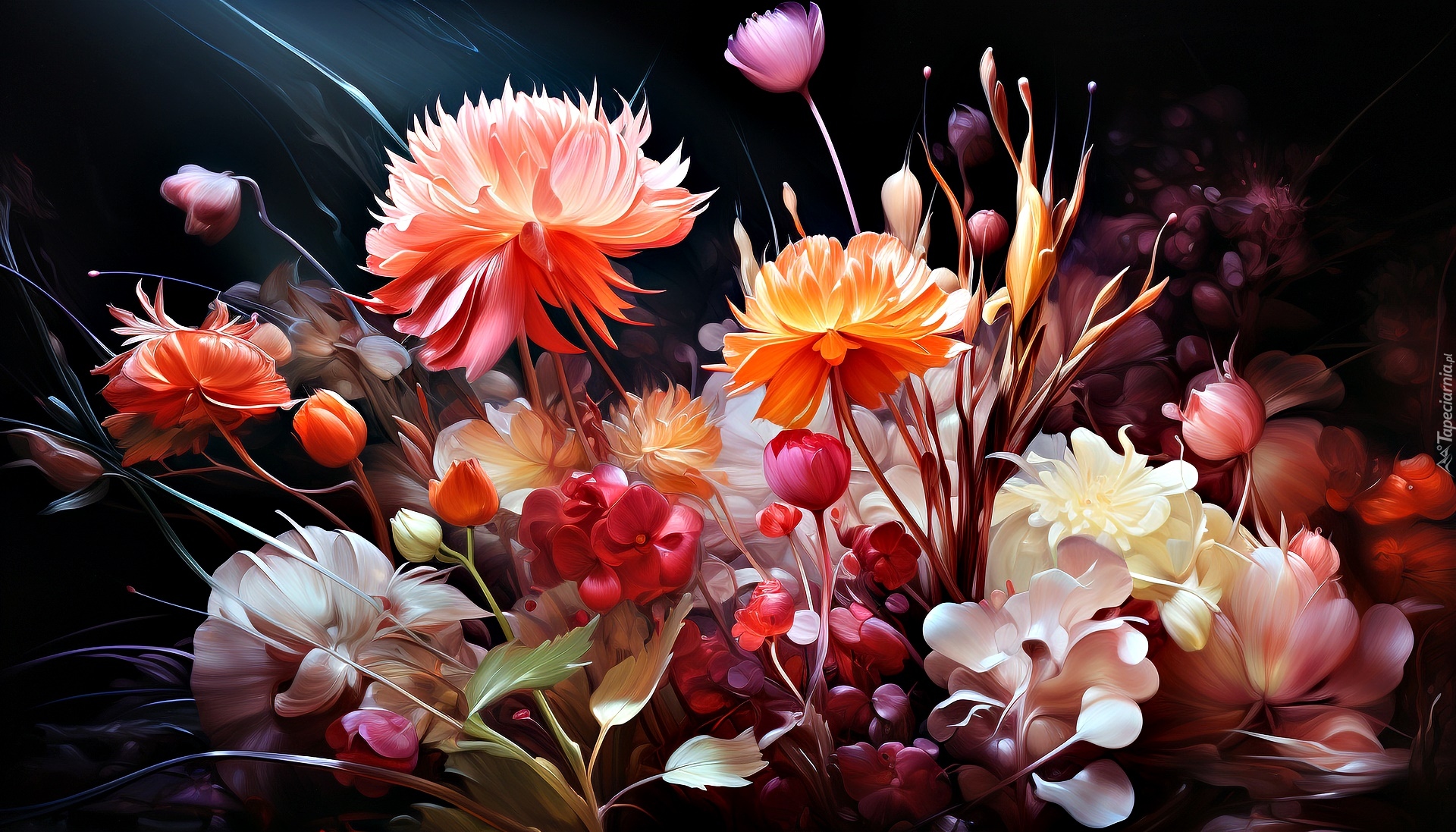 Edytor tapety: Rozświetlony bukiet kolorowych kwiatów w grafice