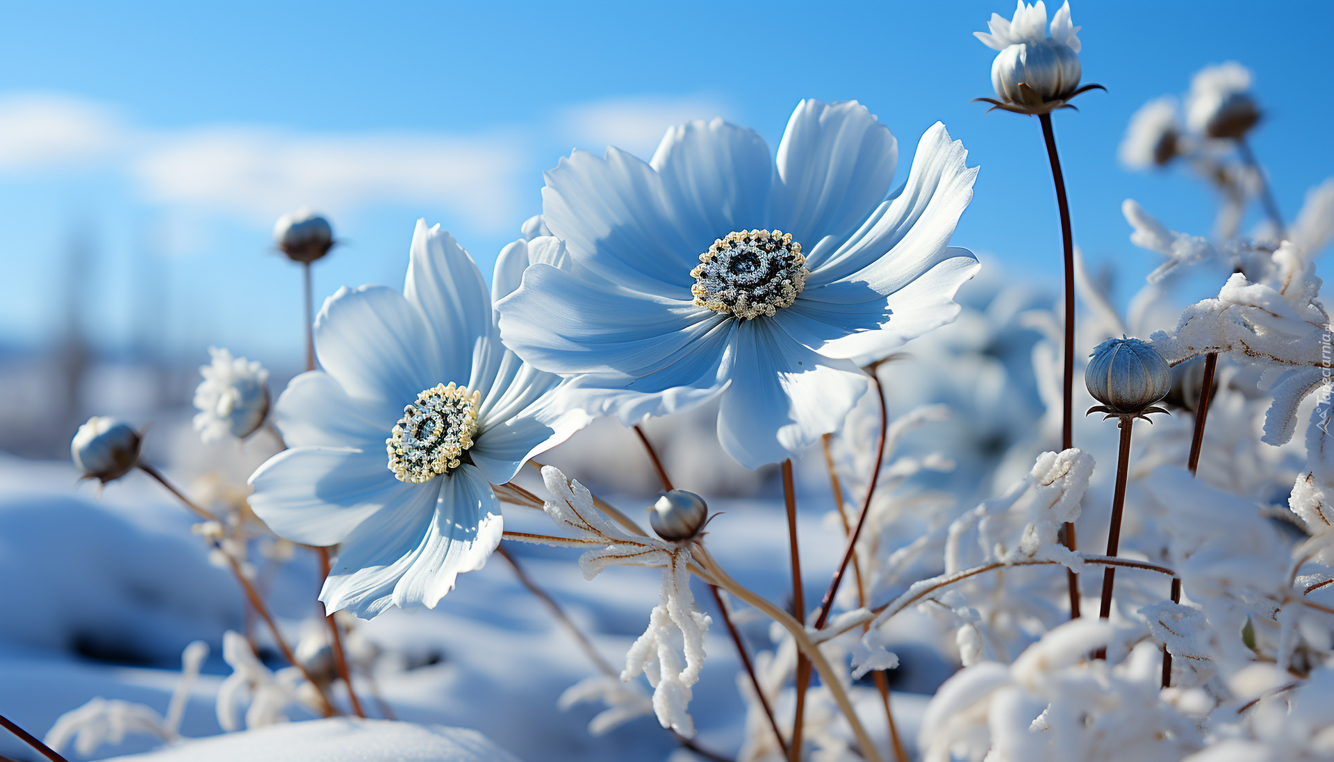 Edytor tapety: Białe kwiaty w śniegu w grafice