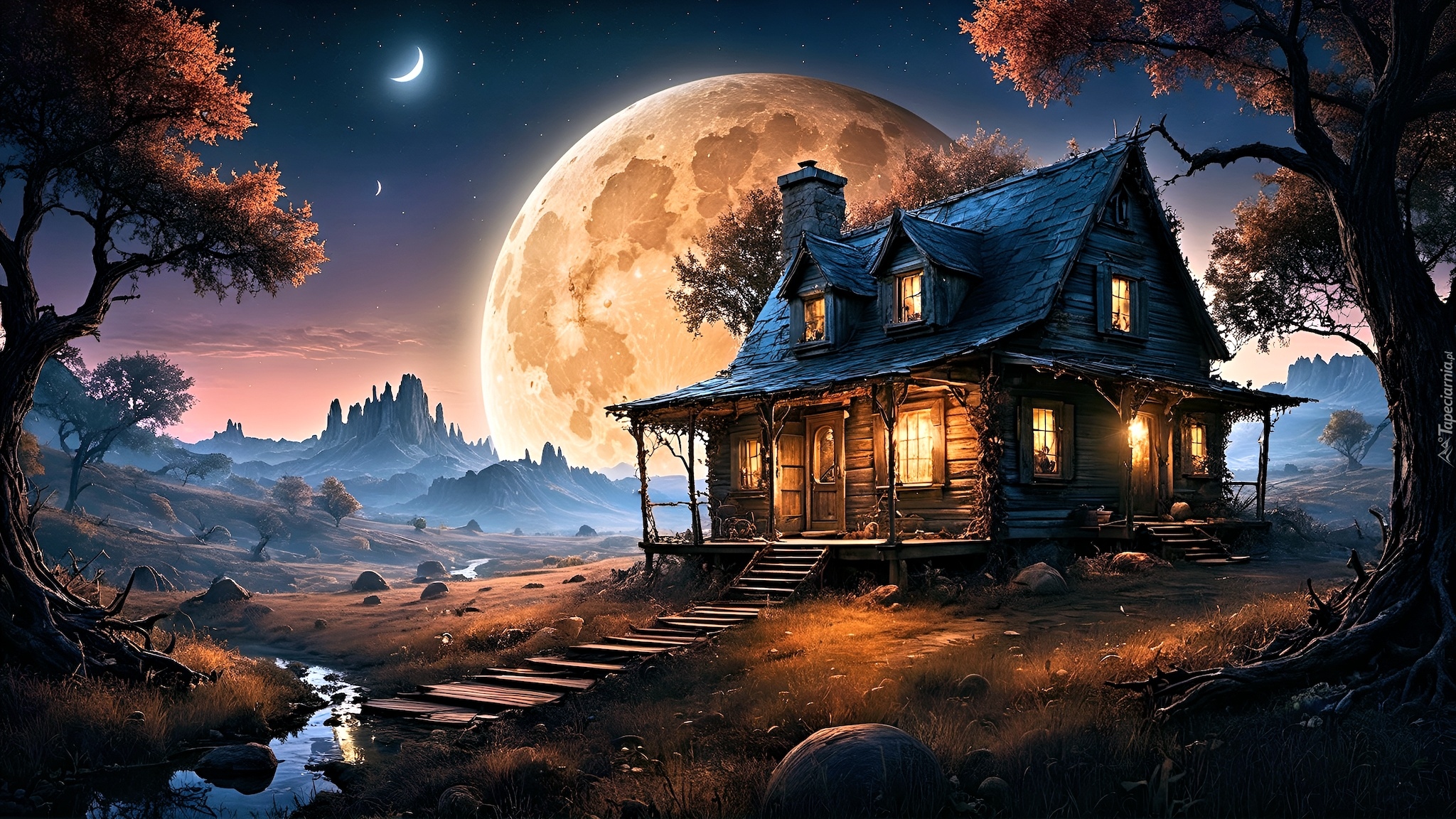 Edytor tapety: Oświetlony drewniany domek na tle księżyca w pełni