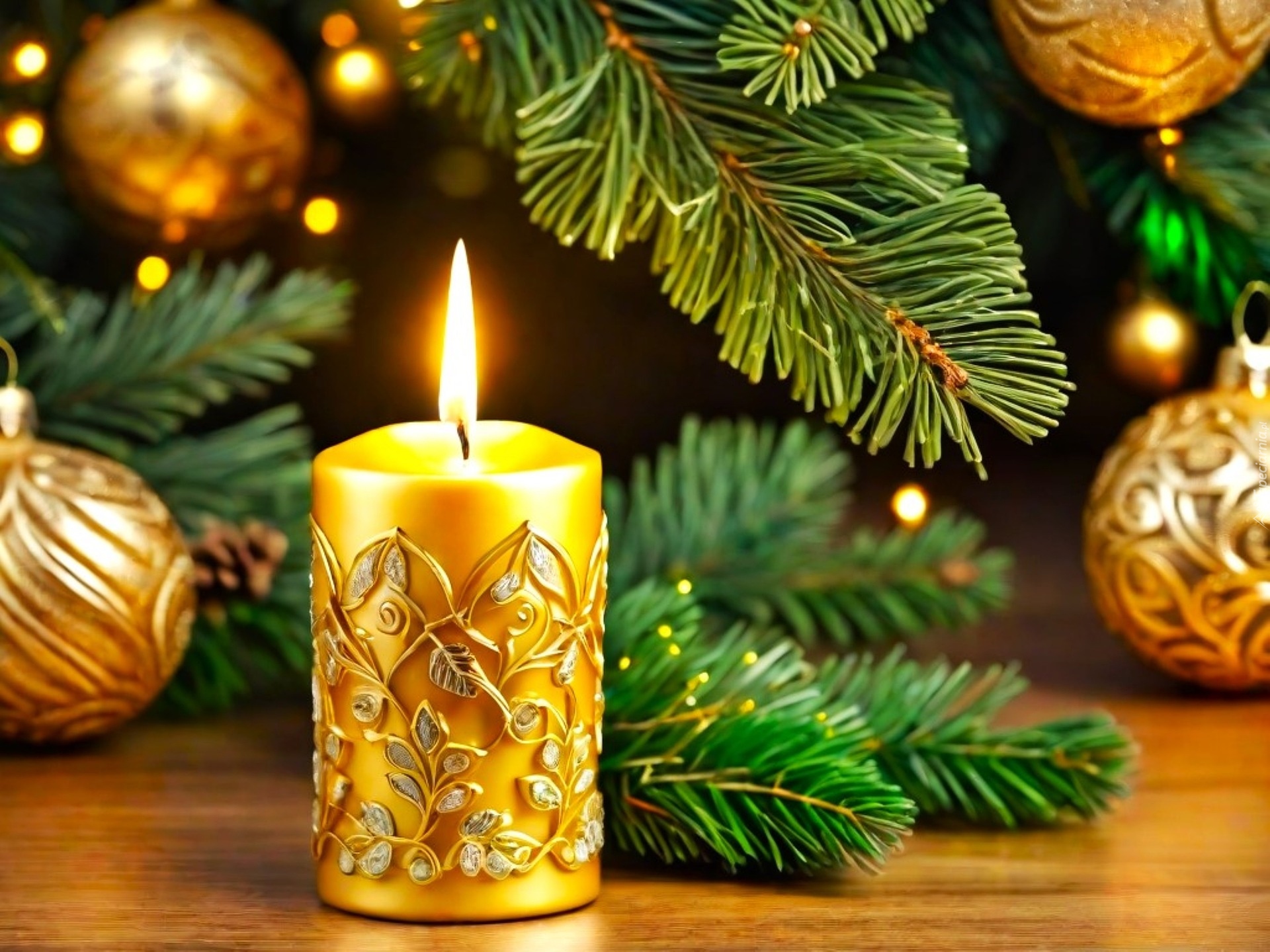 Edytor tapety: Złote bombki i zapalona świeca obok gałązek choinki