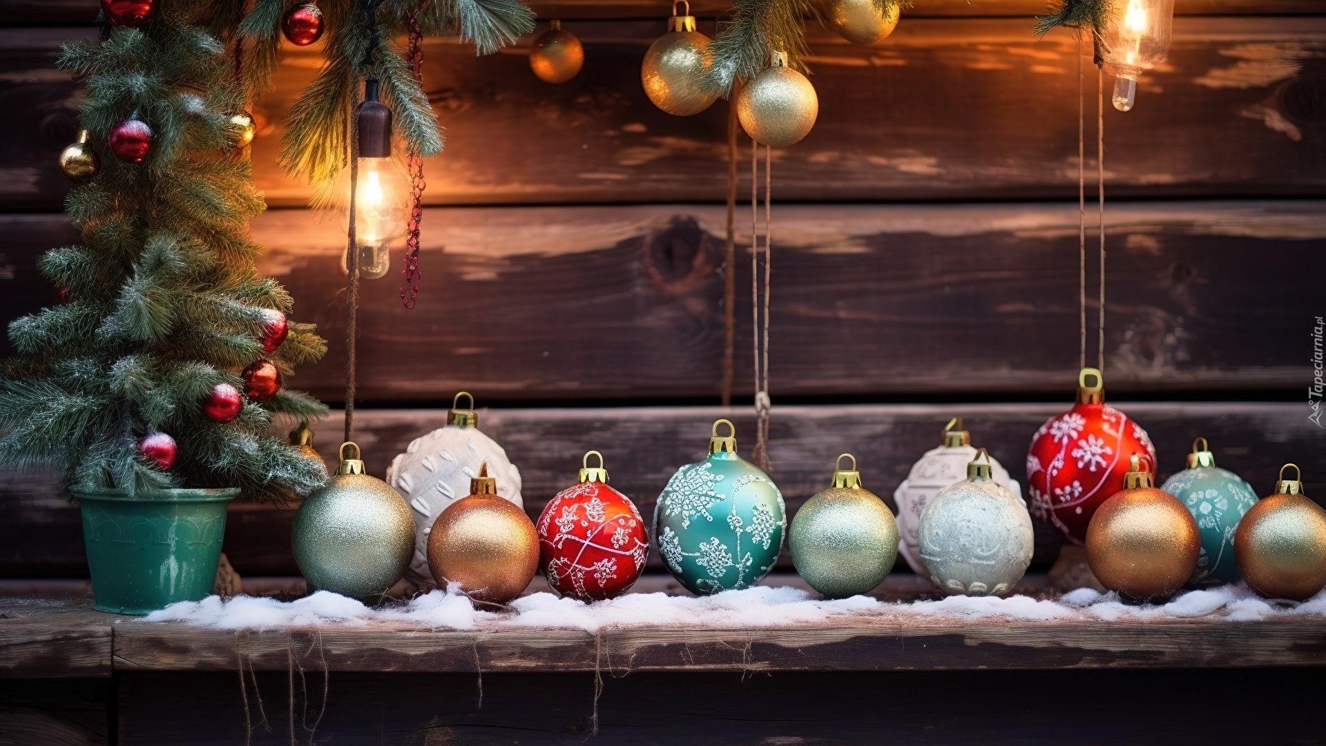 Edytor tapety: Choinka i kolorowe bombki na parapecie okna