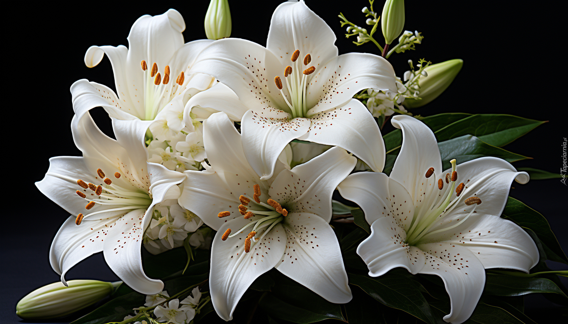 Edytor tapety: Białe lilie z pąkami na czarnym tle