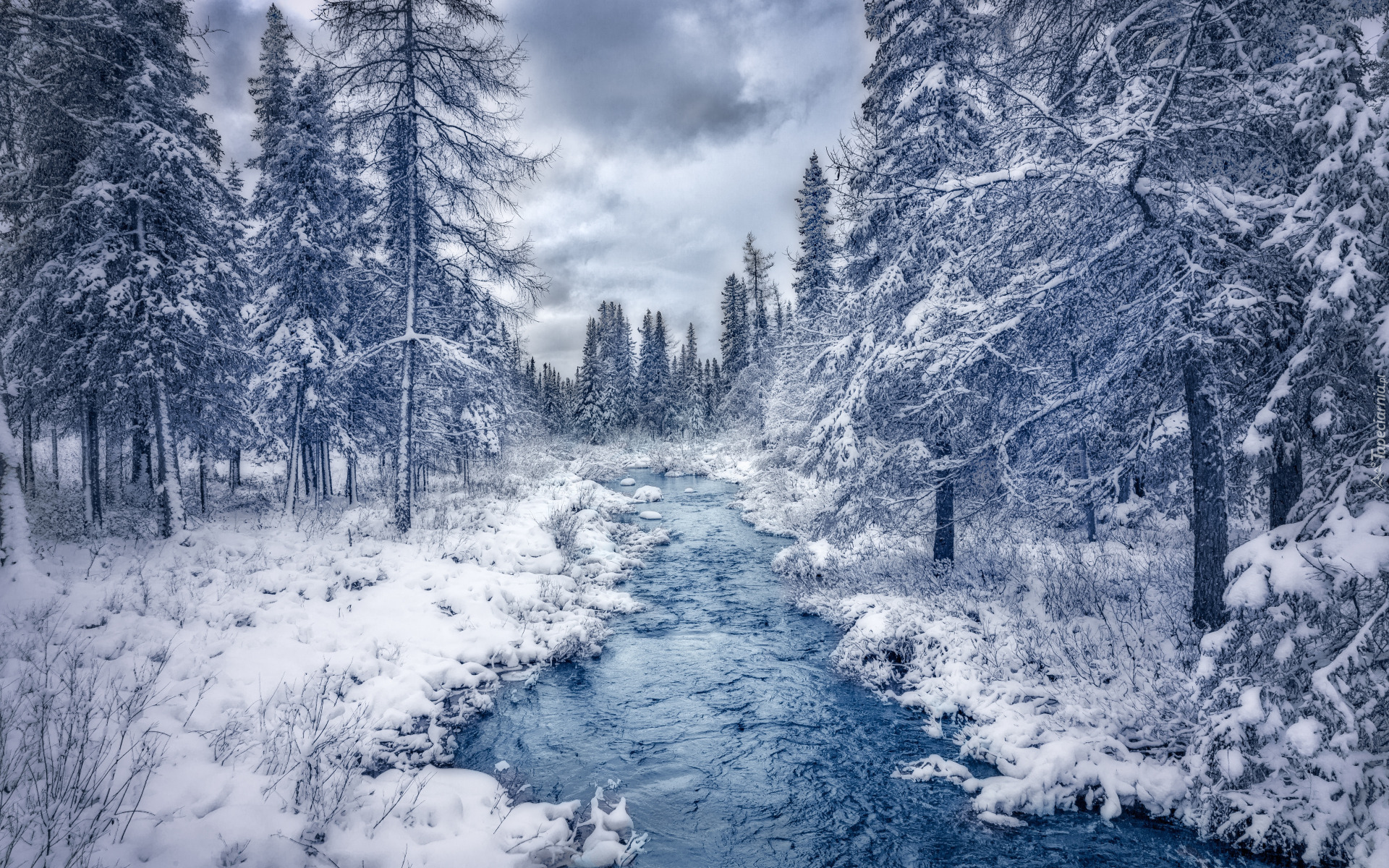 Edytor tapety: Pochmurne niebo nad zimowym lasem i rzeką