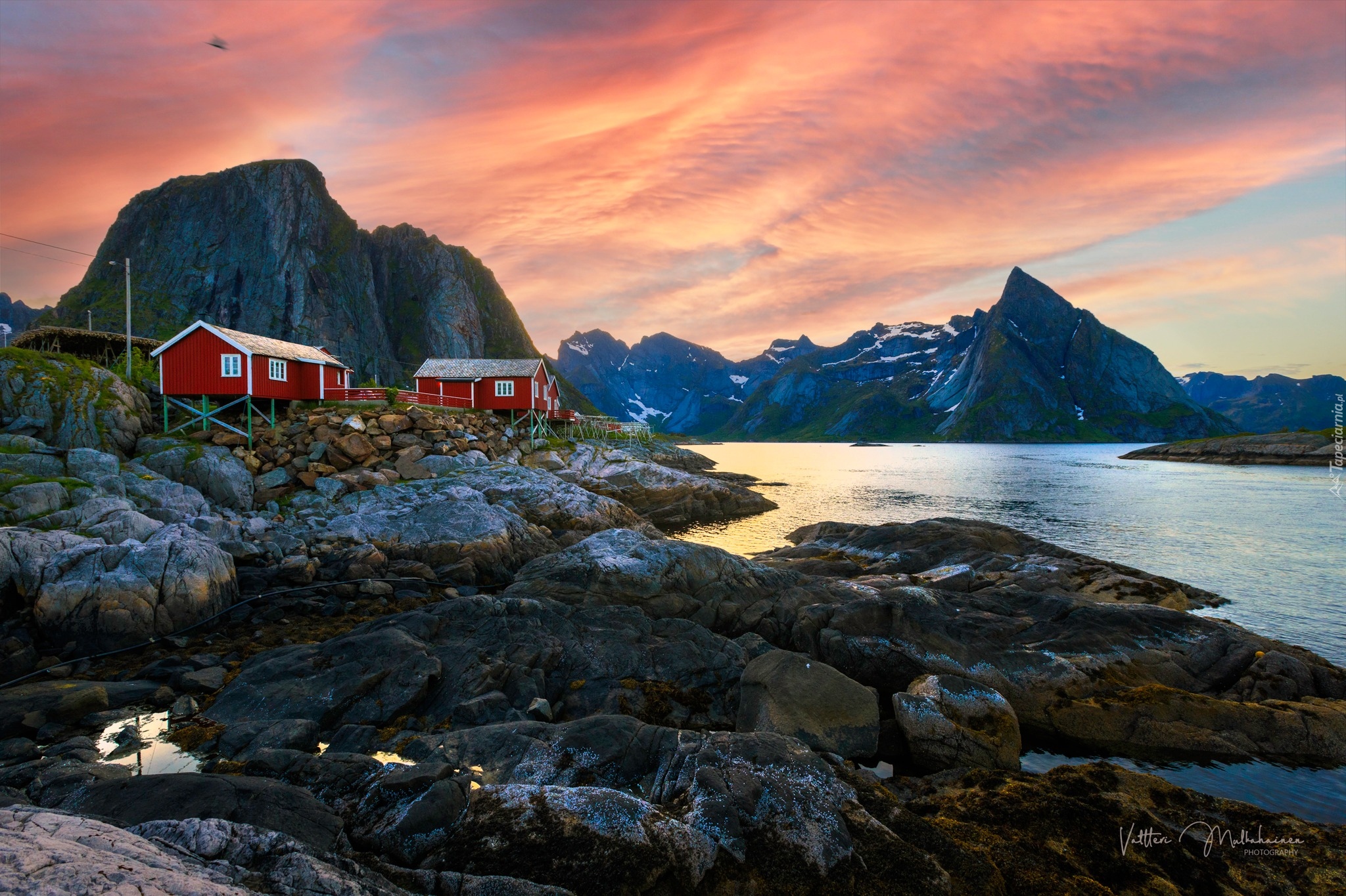 Edytor tapety: Drewniane czerwone domki na norweskich Lofotach