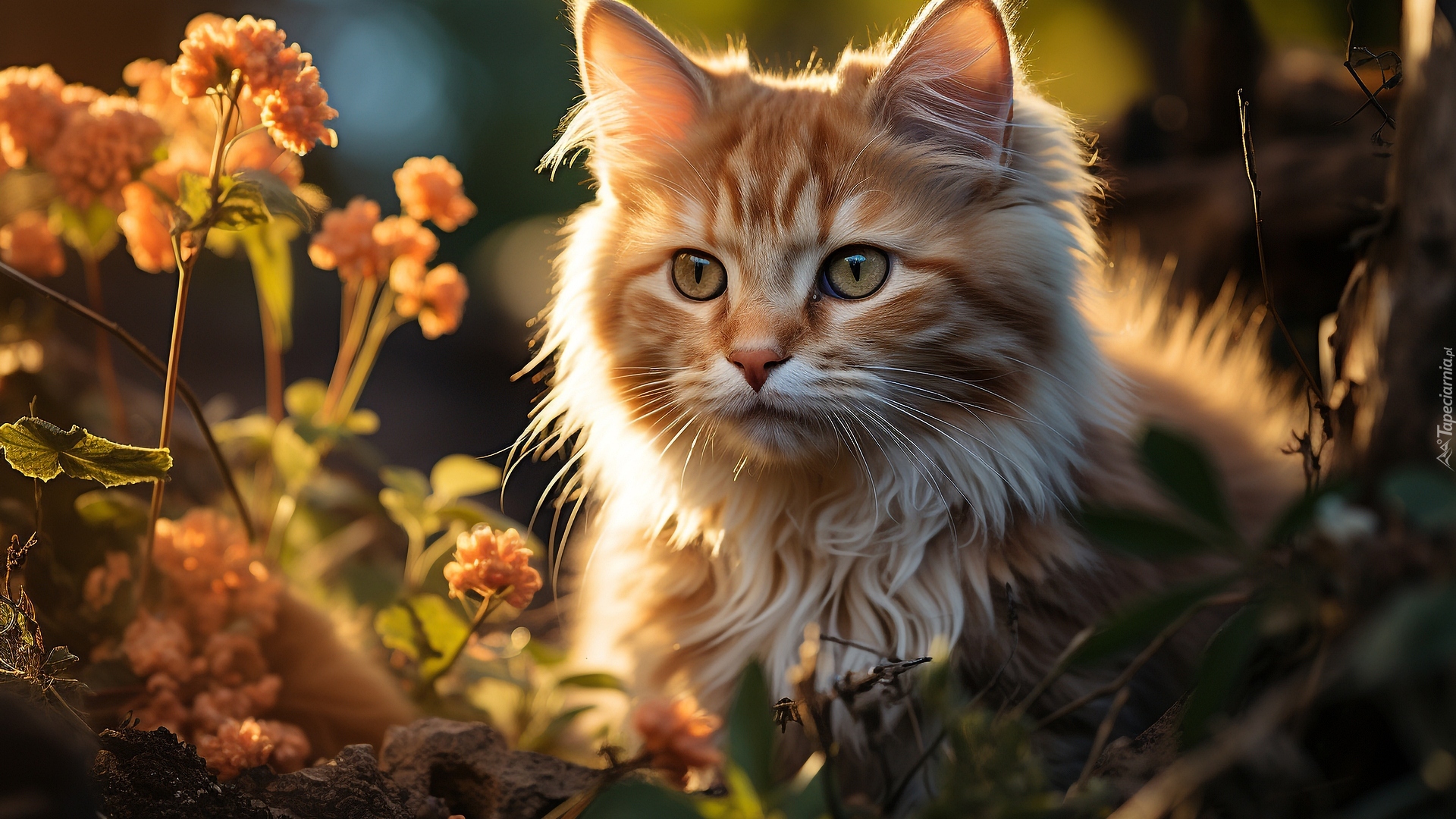 Edytor tapety: Rudawy kot wśród rozświetlonych roślin
