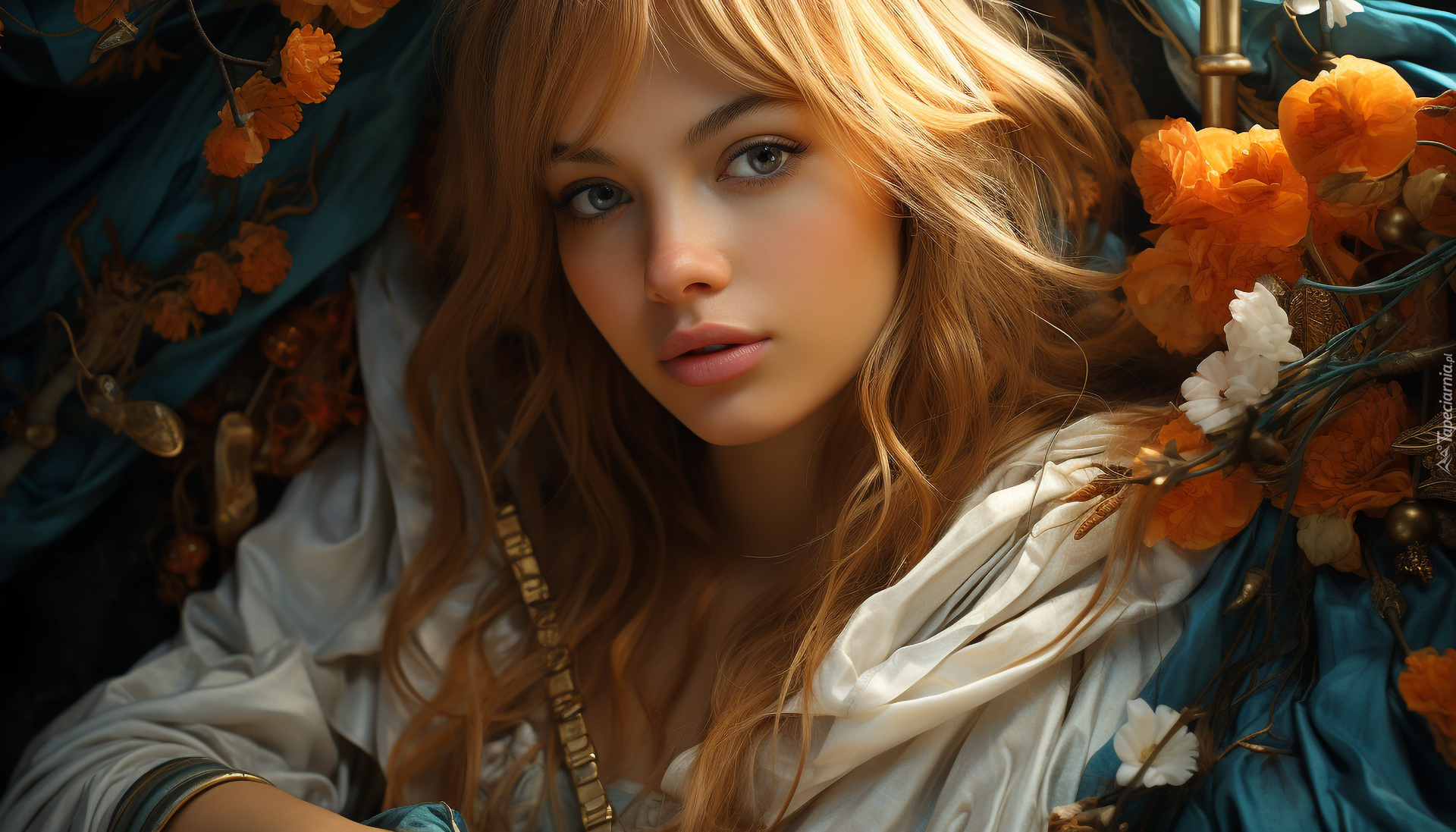 Edytor tapety: Blondynka w białej bluzce otoczona kwiatami