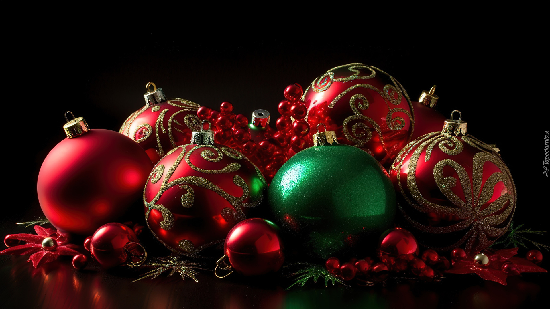 Edytor tapety: Kolorowe ozdobne bombki na czarnym tle