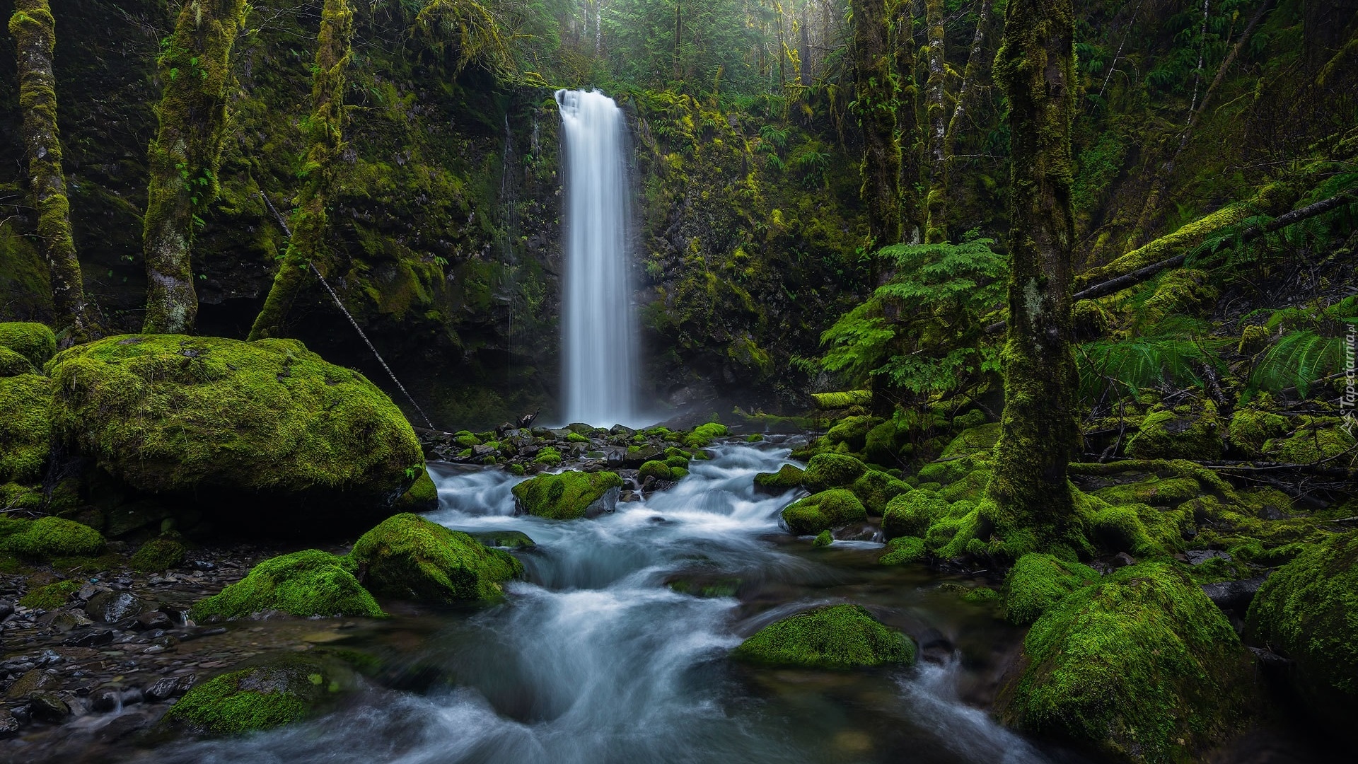 Edytor tapety: Omszałe skały i drzewa przy leśnym wodospadzie