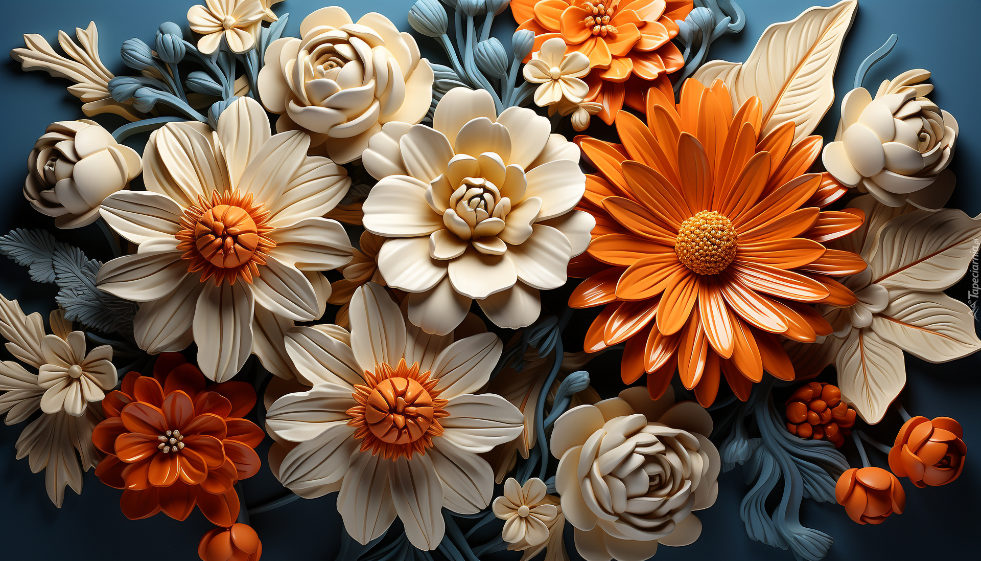 Edytor tapety: Pomarańczowe i kremowe kwiaty na niebieskim tle