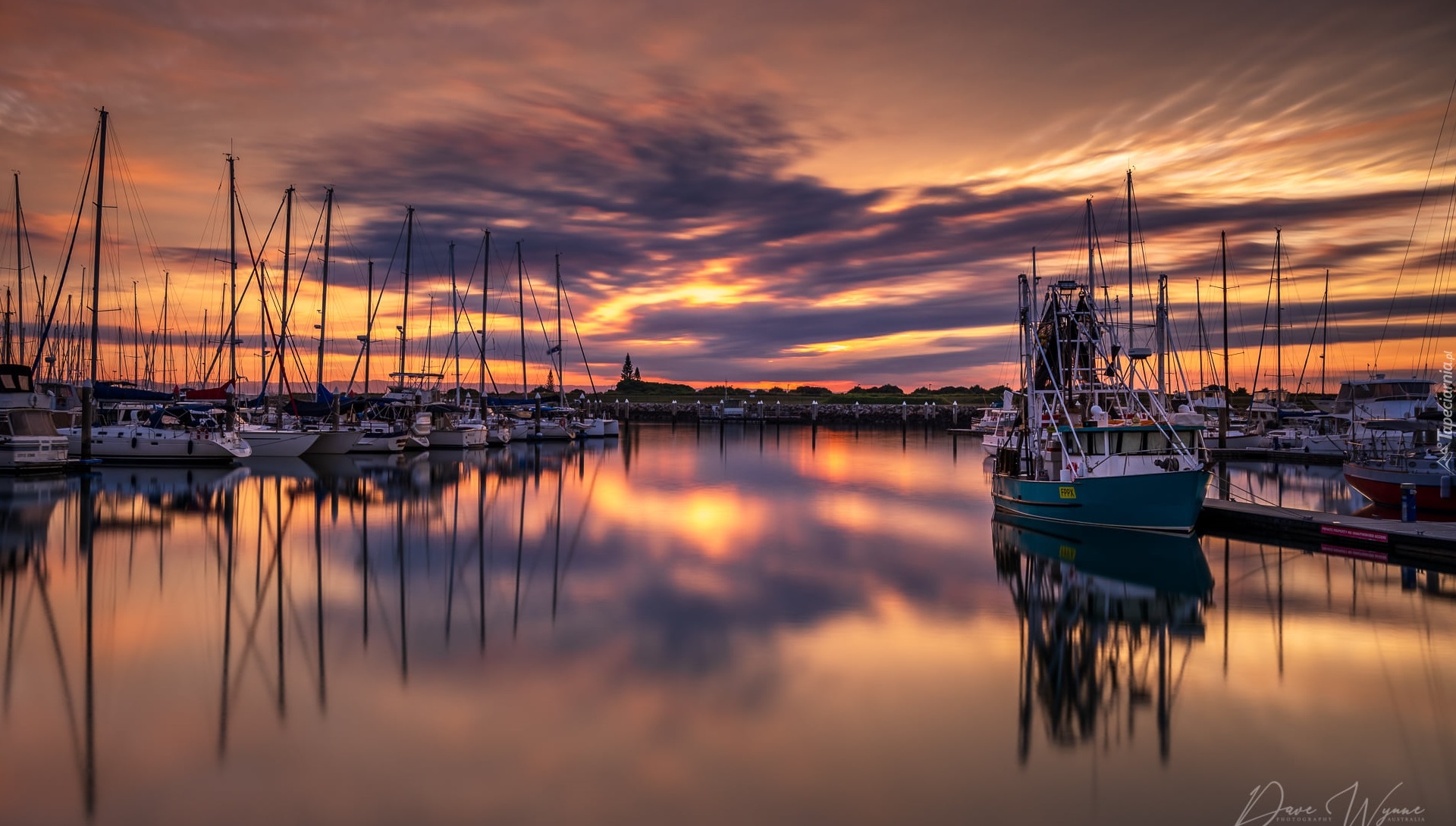 Edytor tapety: Żaglówki na przystani pod niebem zachodzącego słońca