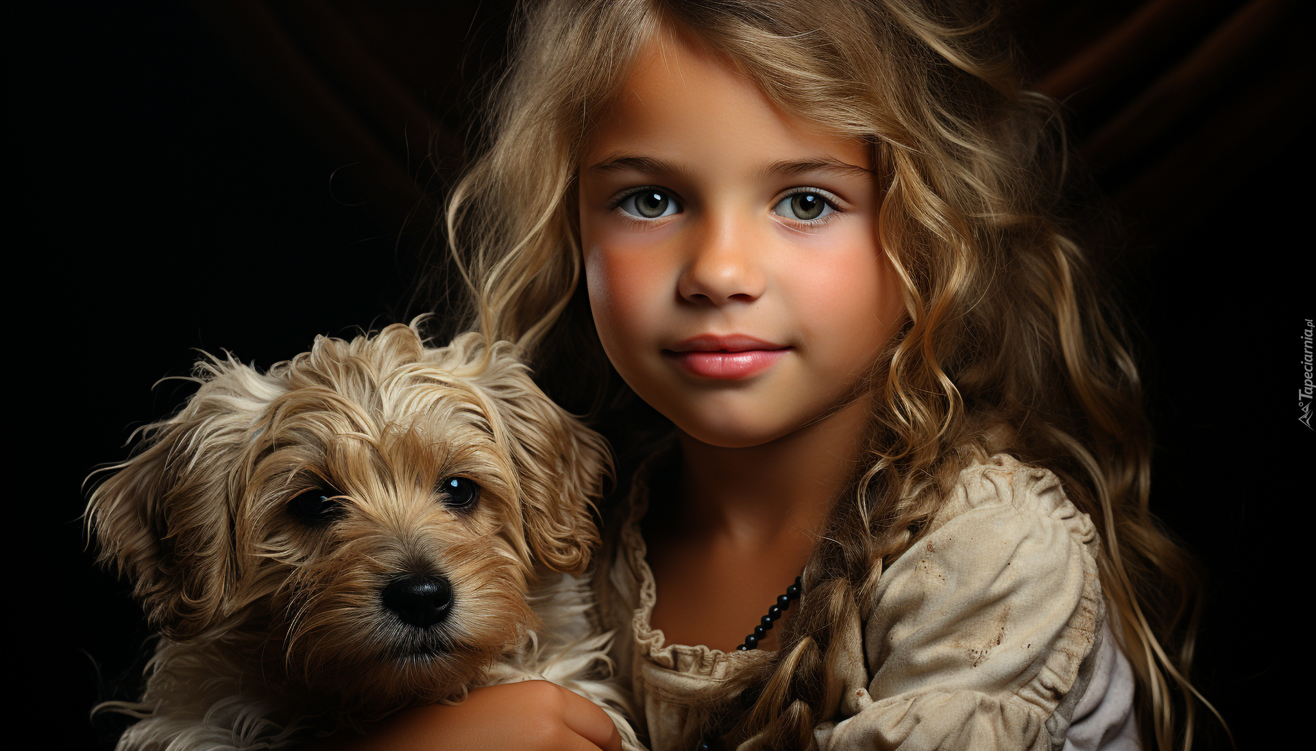 Edytor tapety: Dziewczynka z długimi włosami ze szczeniakiem w ramionach