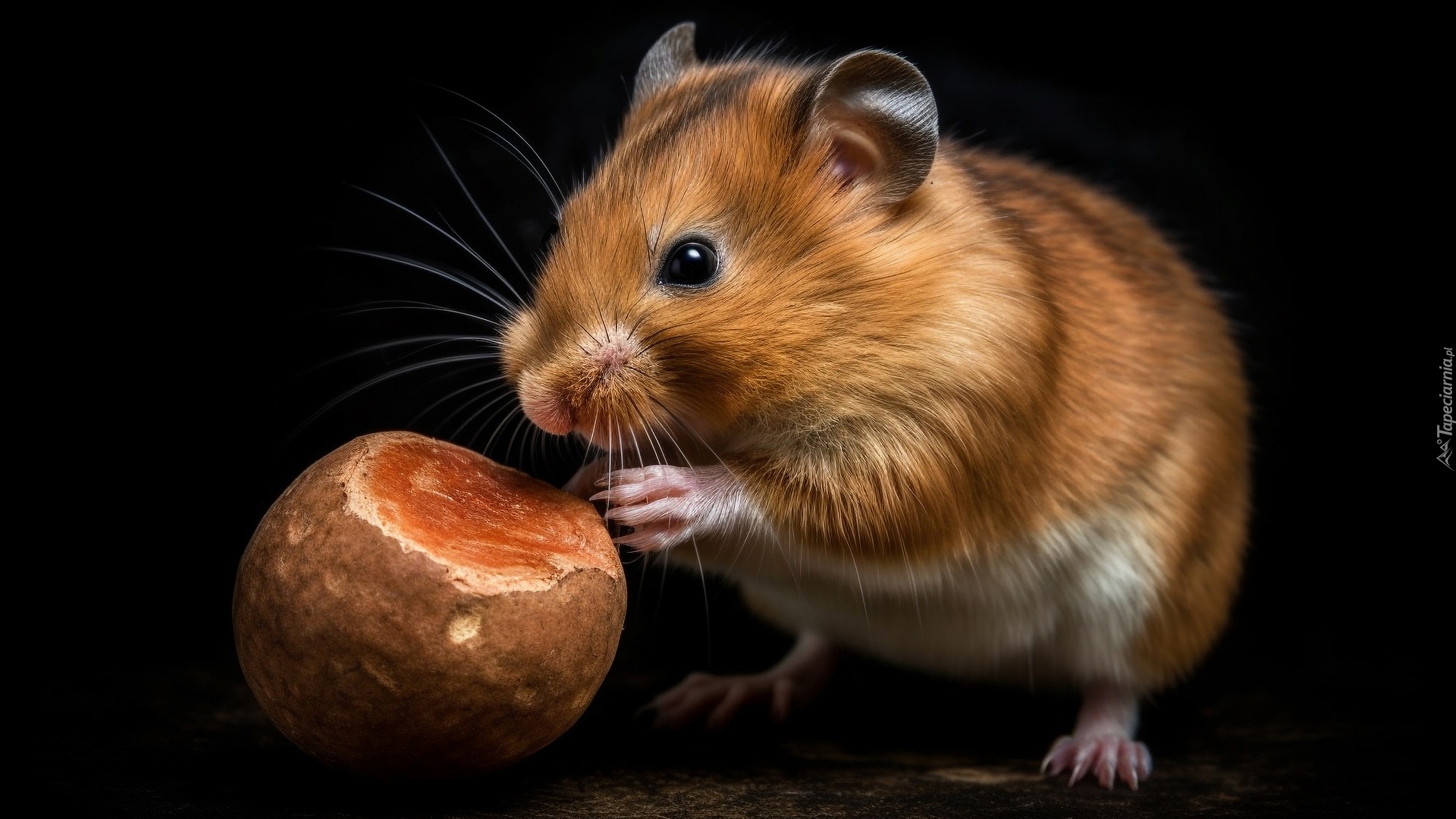 Edytor tapety: Rudy chomik z jedzeniem na czarnym tle