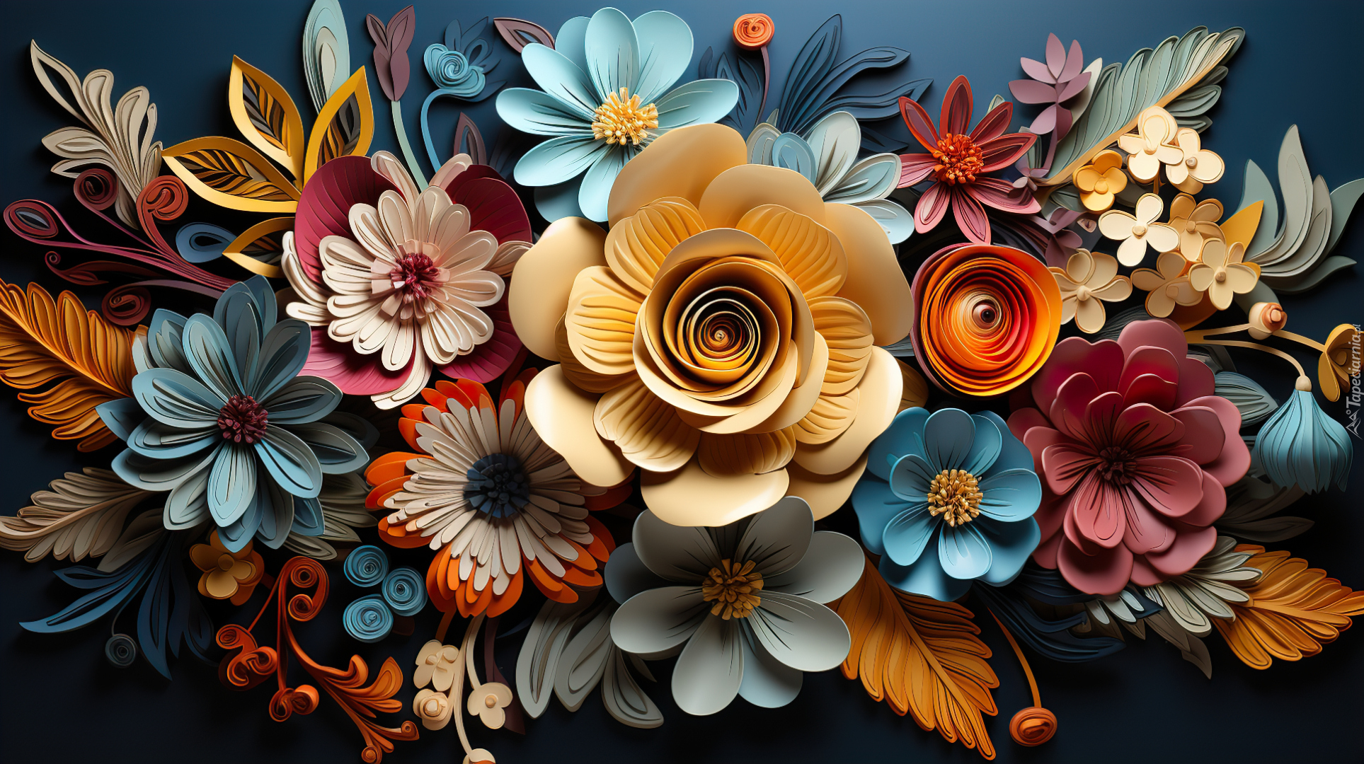 Edytor tapety: Kolorowe kwiaty na niebieskim tle w grafice 2D