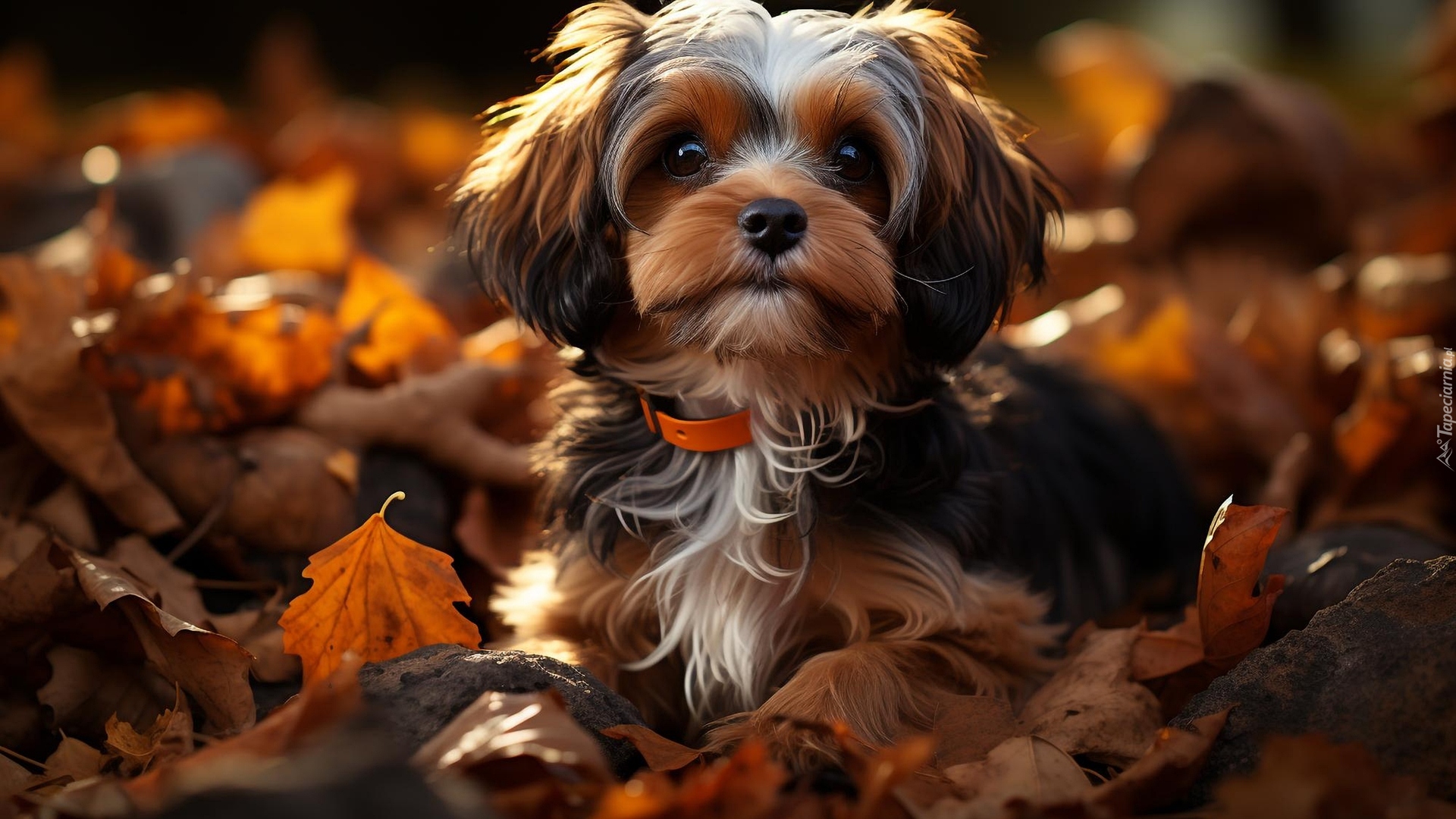 Edytor tapety: Yorkshire terrier na rozświetlonych jesiennych liściach