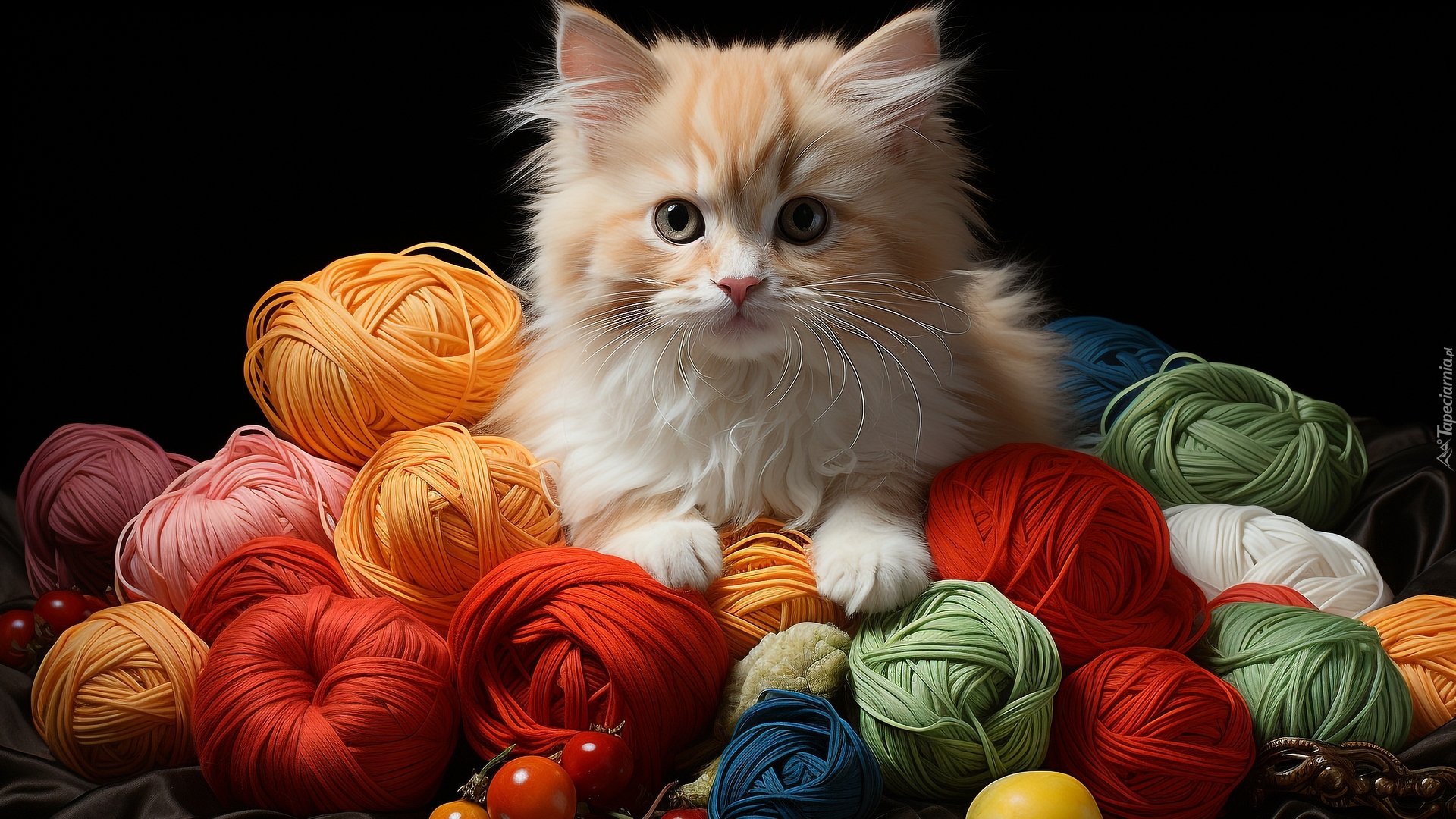 Edytor tapety: Mały kotek leżący na motkach włóczki