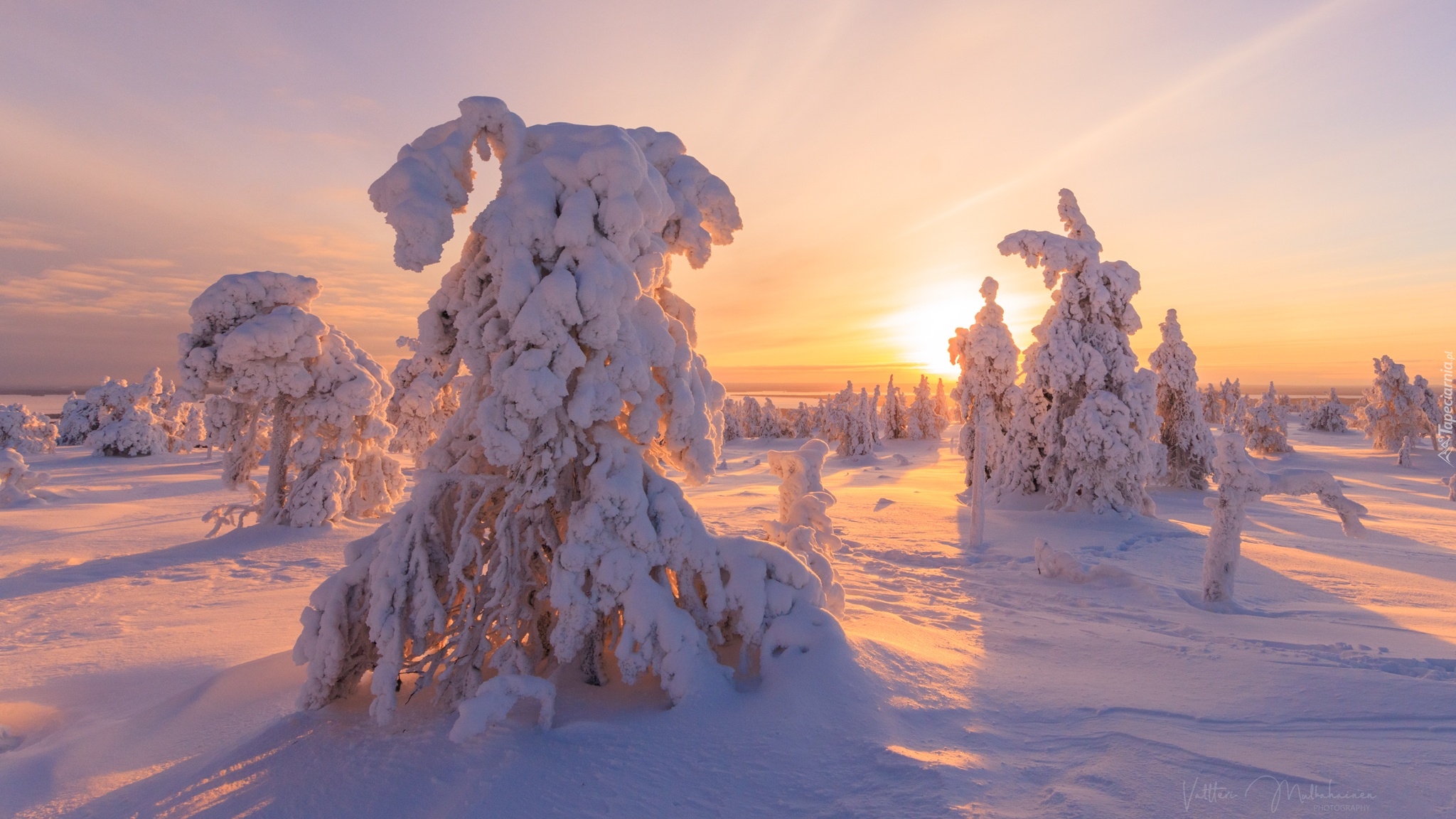Edytor tapety: Rozświetlone słonecznym blaskiem ośnieżone drzewa w śniegu