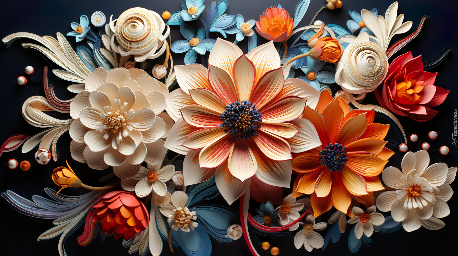 Edytor tapety: Pomarańczowe i kremowe kwiaty na ciemnym tle
