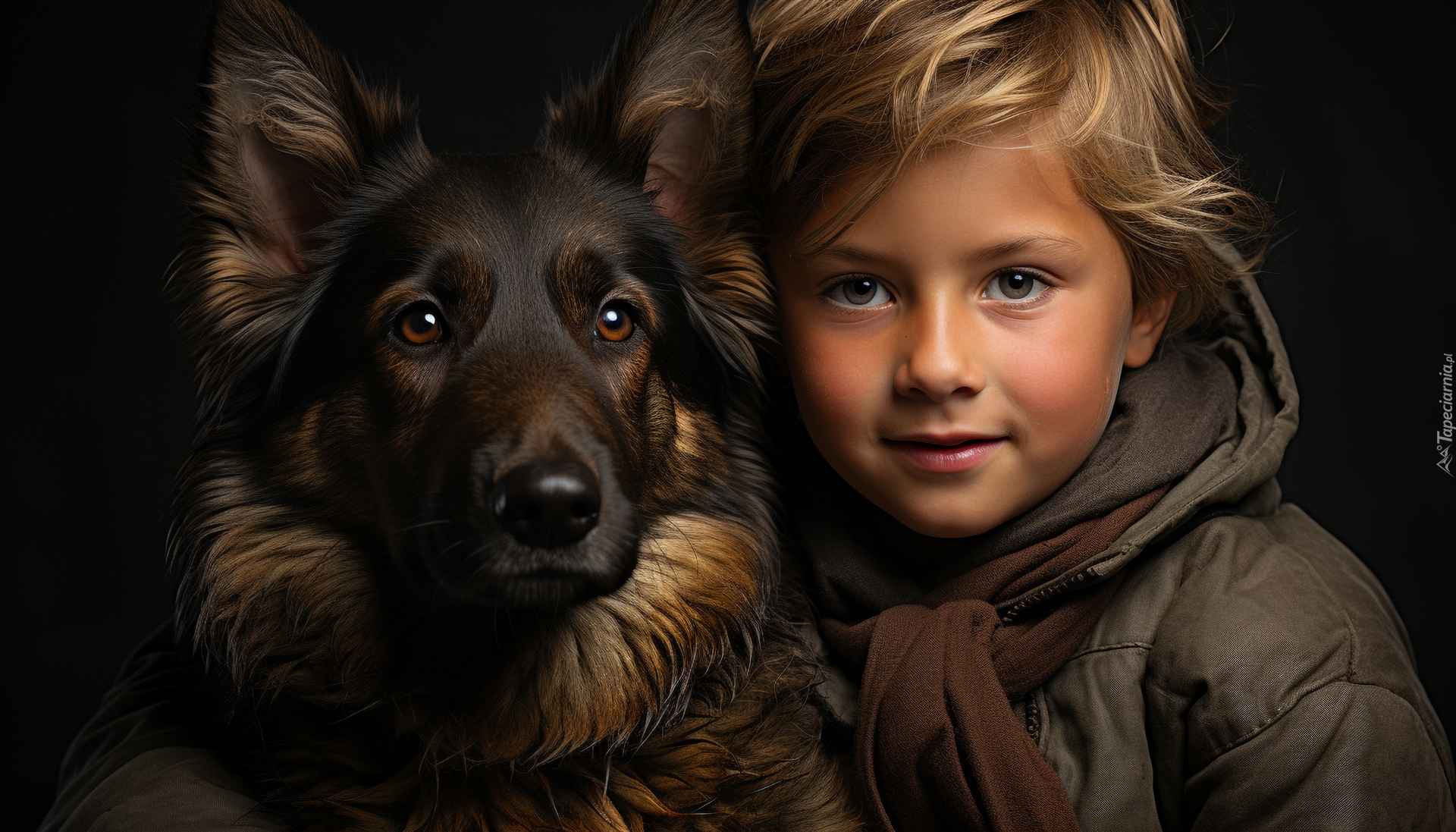 Edytor tapety: Chłopiec w kurtce i szaliku z owczarkiem niemieckim