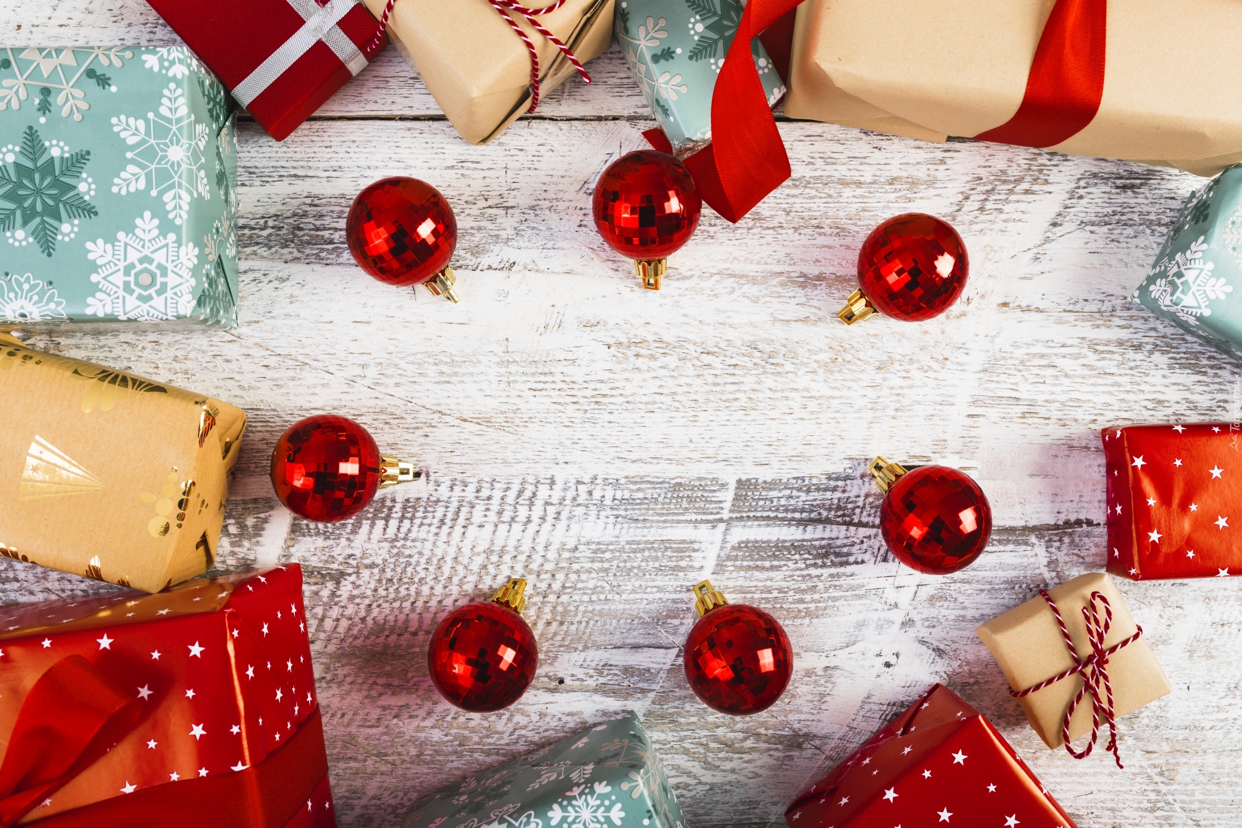 Edytor tapety: Kolorowe pudełka z prezentami i bombki na deskach