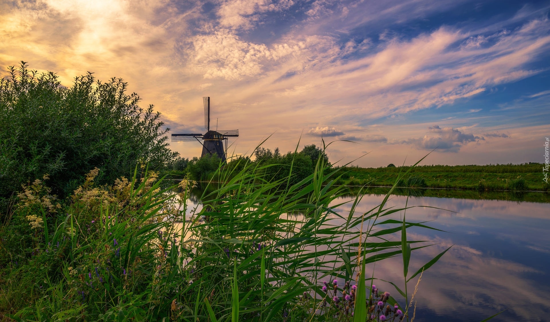 Edytor tapety: Rośliny i drzewa nad rzeką na tle wiatraka