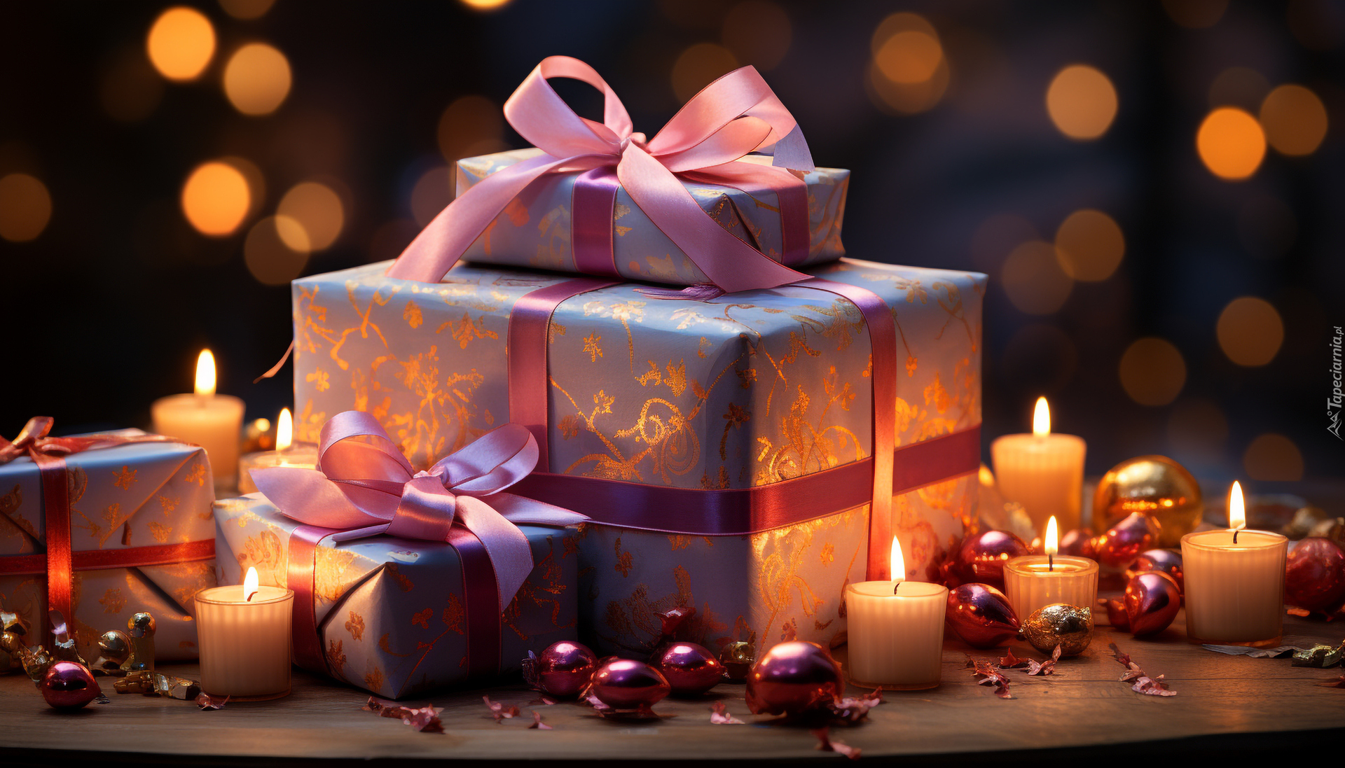Edytor tapety: Prezenty i płonące świece między bombkami na stole
