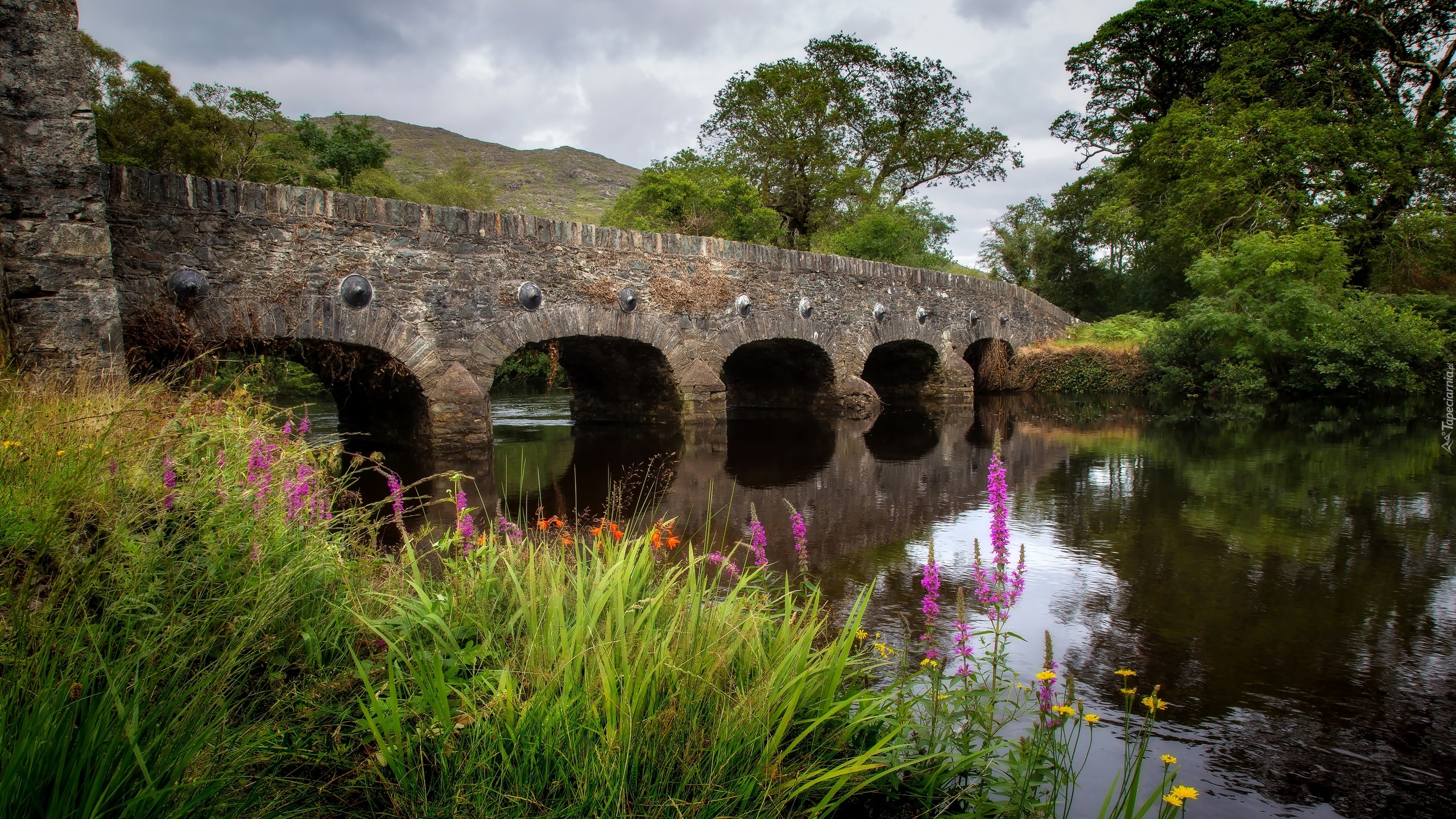 Edytor tapety: Kwiaty i drzewa przy kamiennym moście nad rzeką