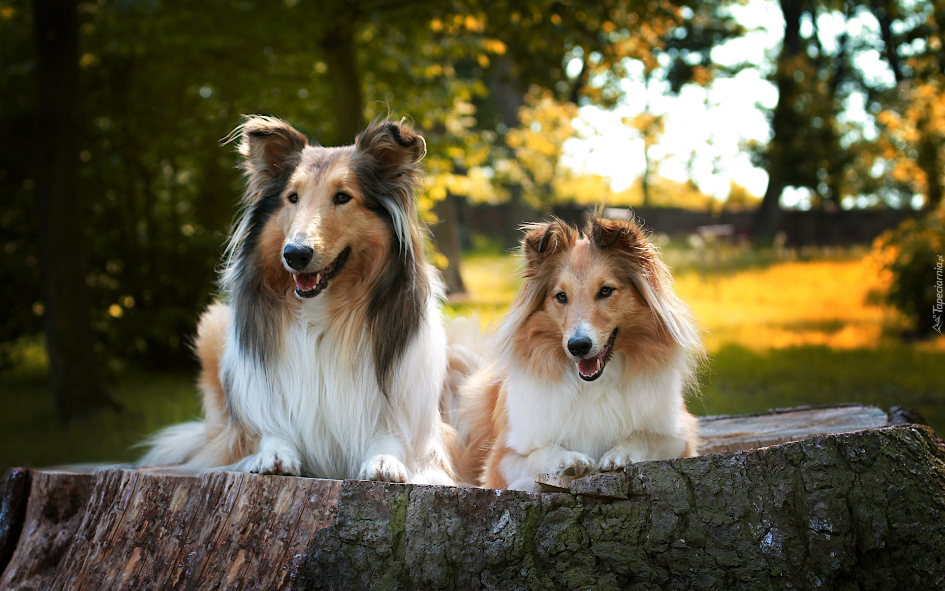 Edytor tapety: Dwa owczarki szkockie leżące na pniu