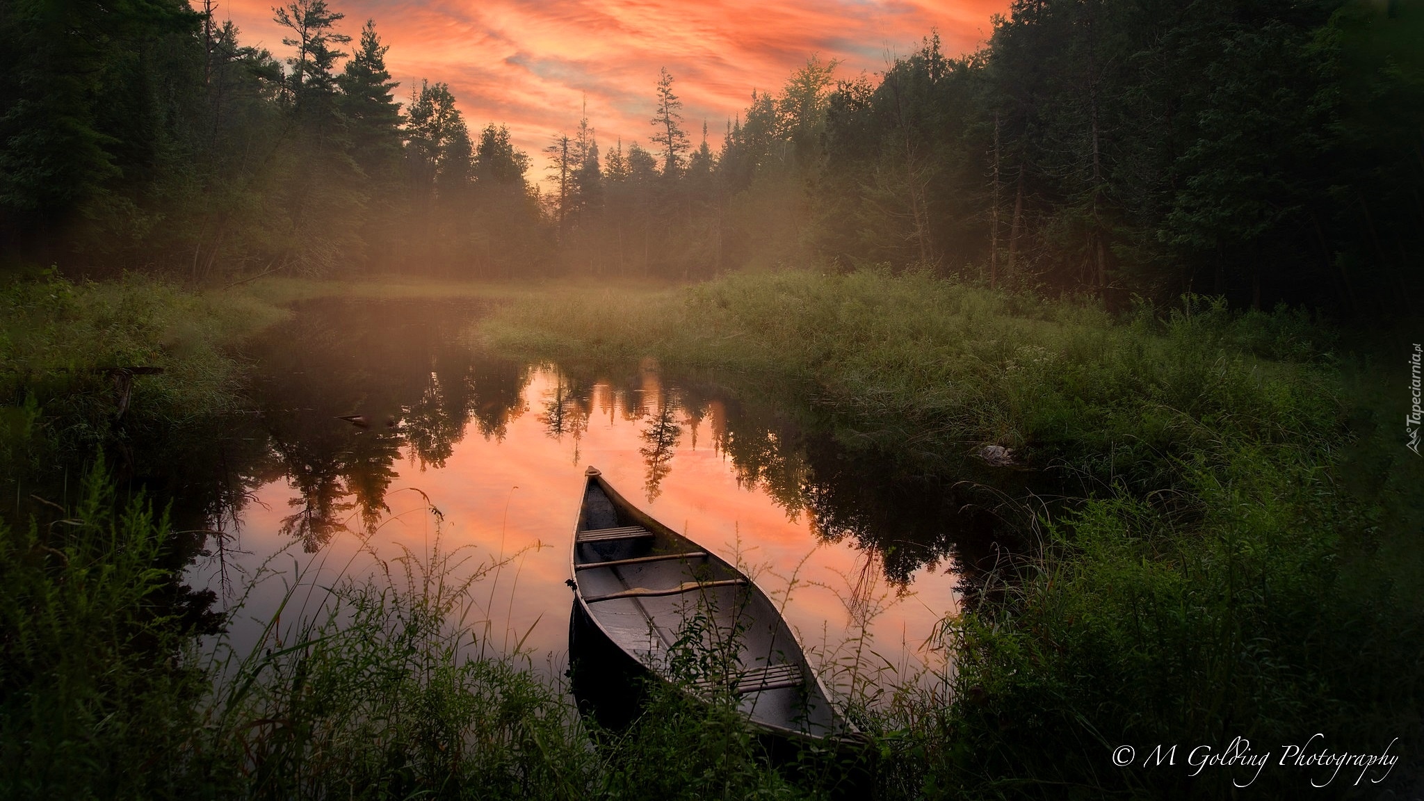 Edytor tapety: Łódka na brzegu stawu w lesie