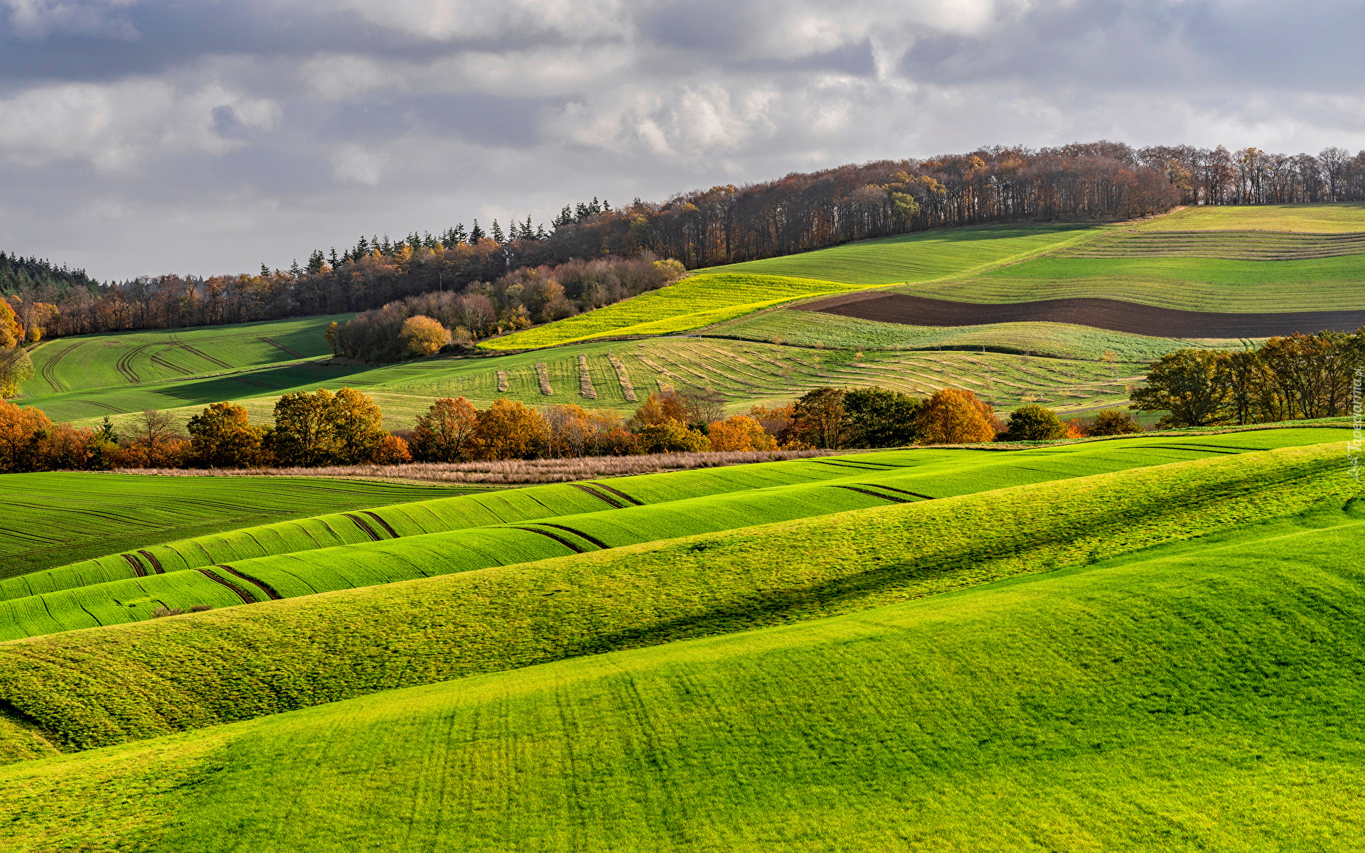 Edytor tapety: Drzewa i pola na zielonych wzgórzach pod chmurami