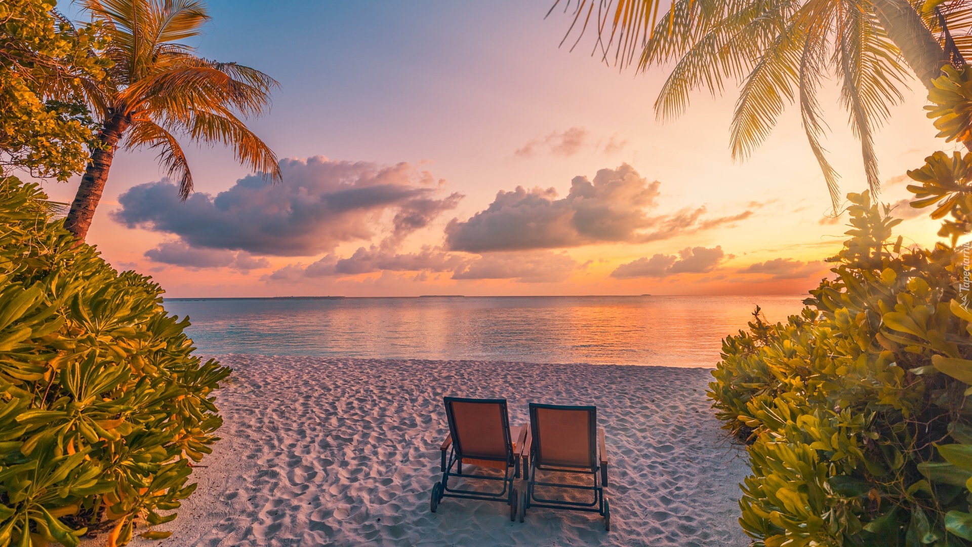 Edytor tapety: Dwa leżaki na morskiej plaży pomiędzy palmami