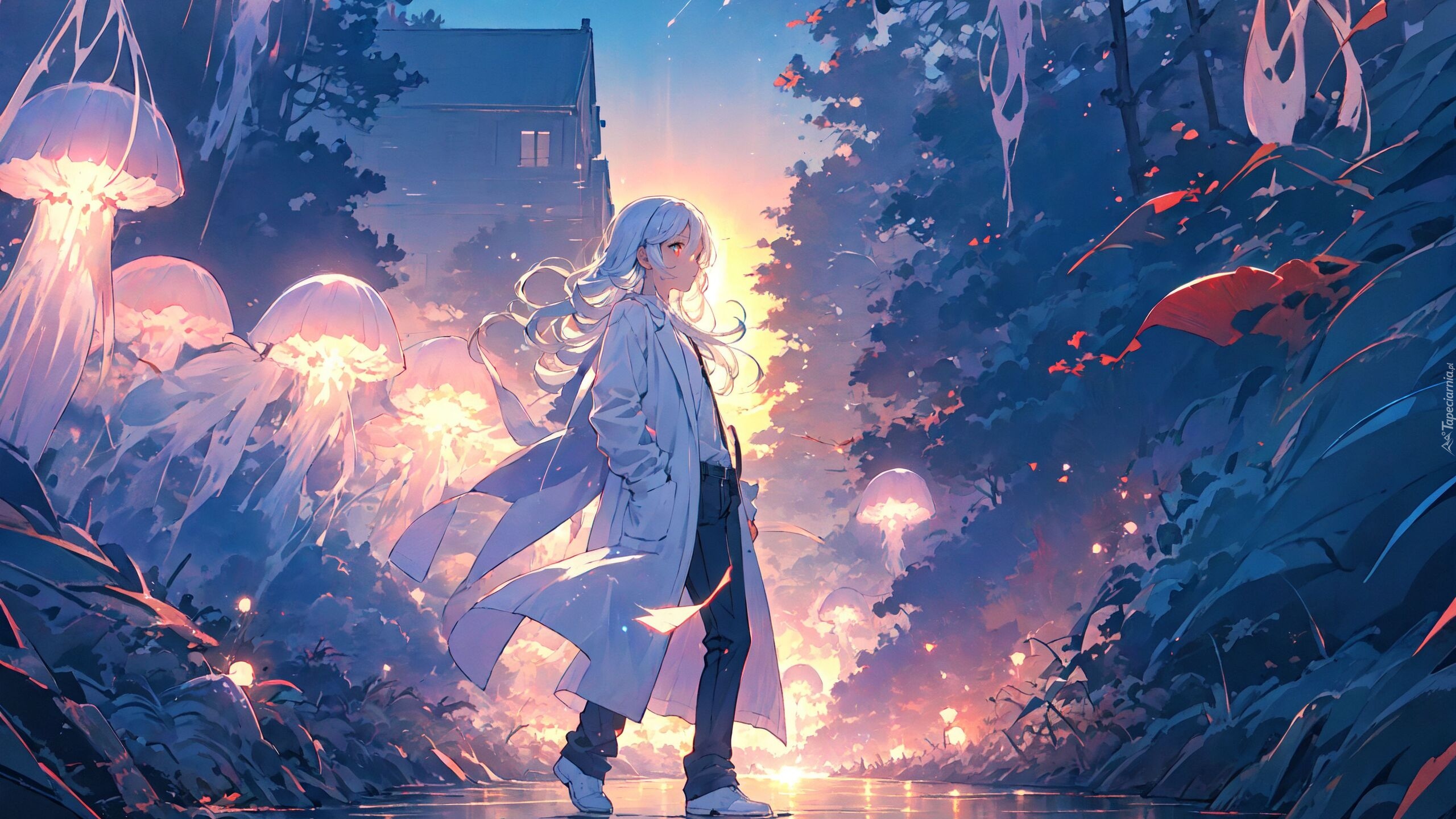 Edytor tapety: Dziewczyna w płaszczu wśród meduz