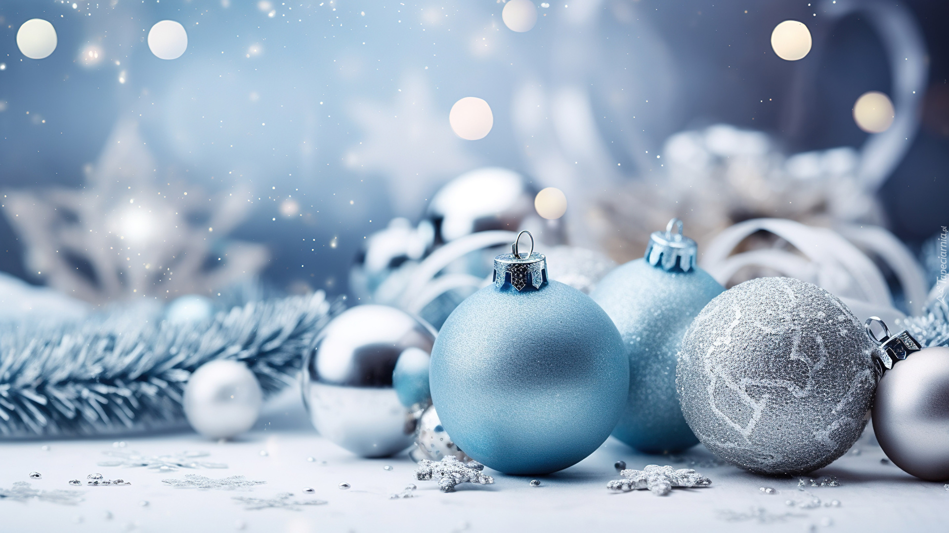 Edytor tapety: Niebieskie i srebrne bombki na rozmytym tle
