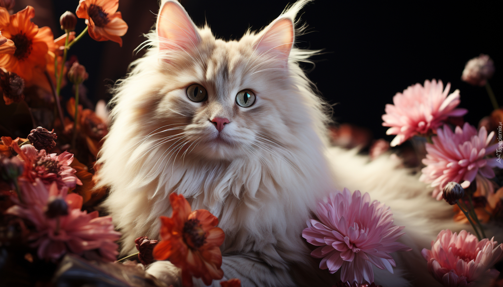 Edytor tapety: Biały puszysty kot wśród kwiatów