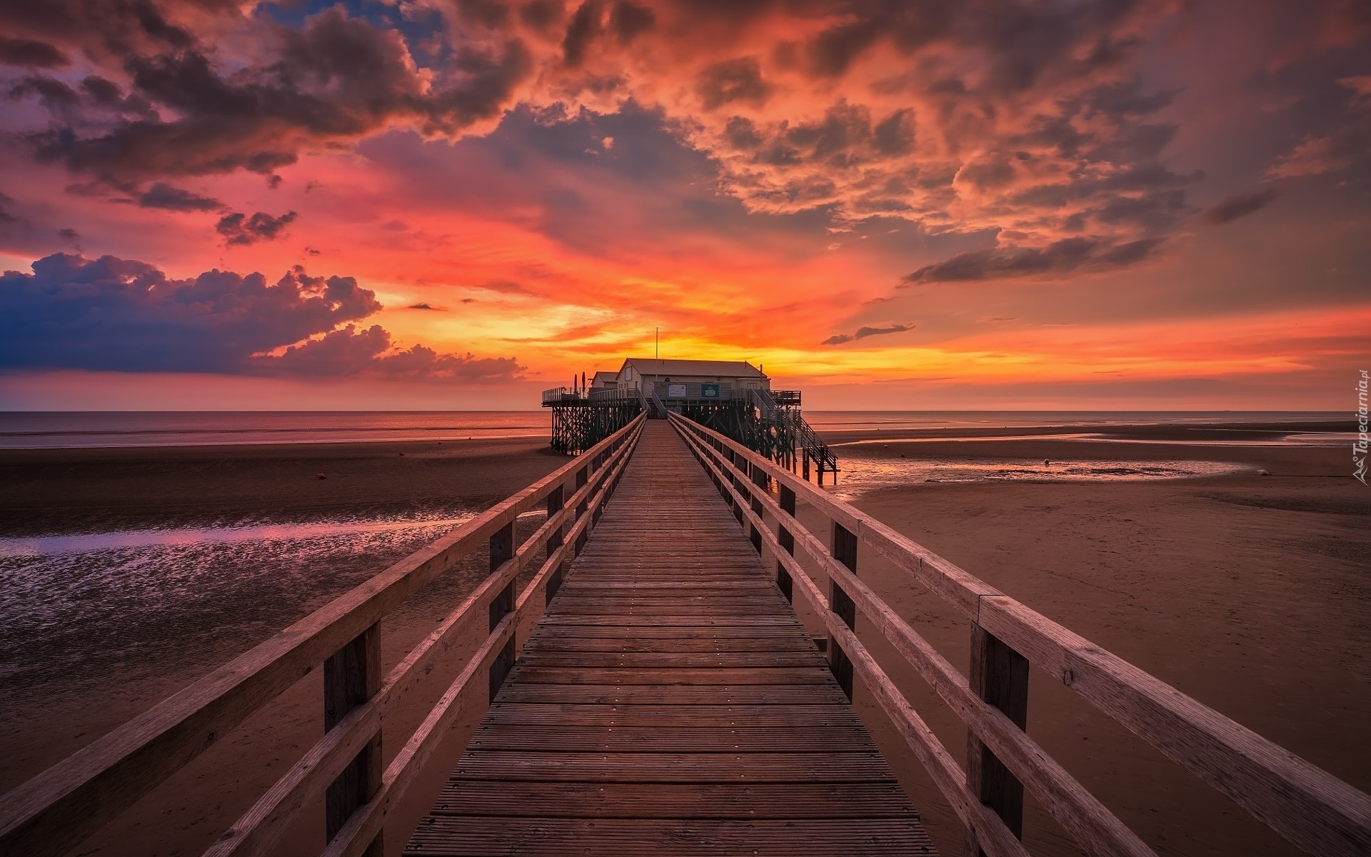 Edytor tapety: Morze plaża i molo o zachodzie słońca