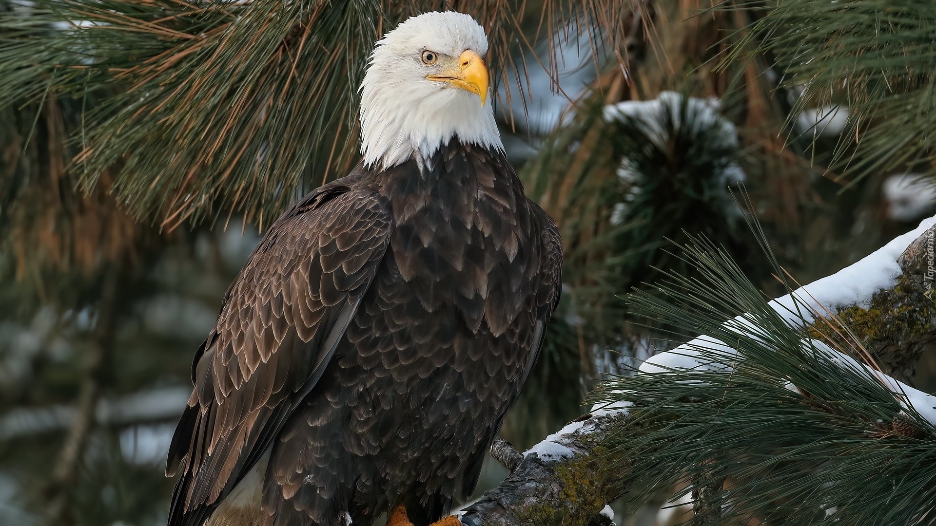 Edytor tapety: Bielik amerykański na ośnieżonej sosnowej gałęzi