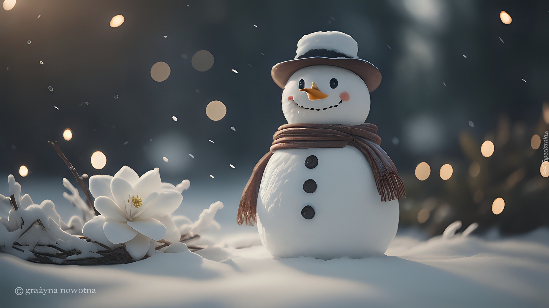 Edytor tapety: Bałwan na śniegu obok kępki kwiatów