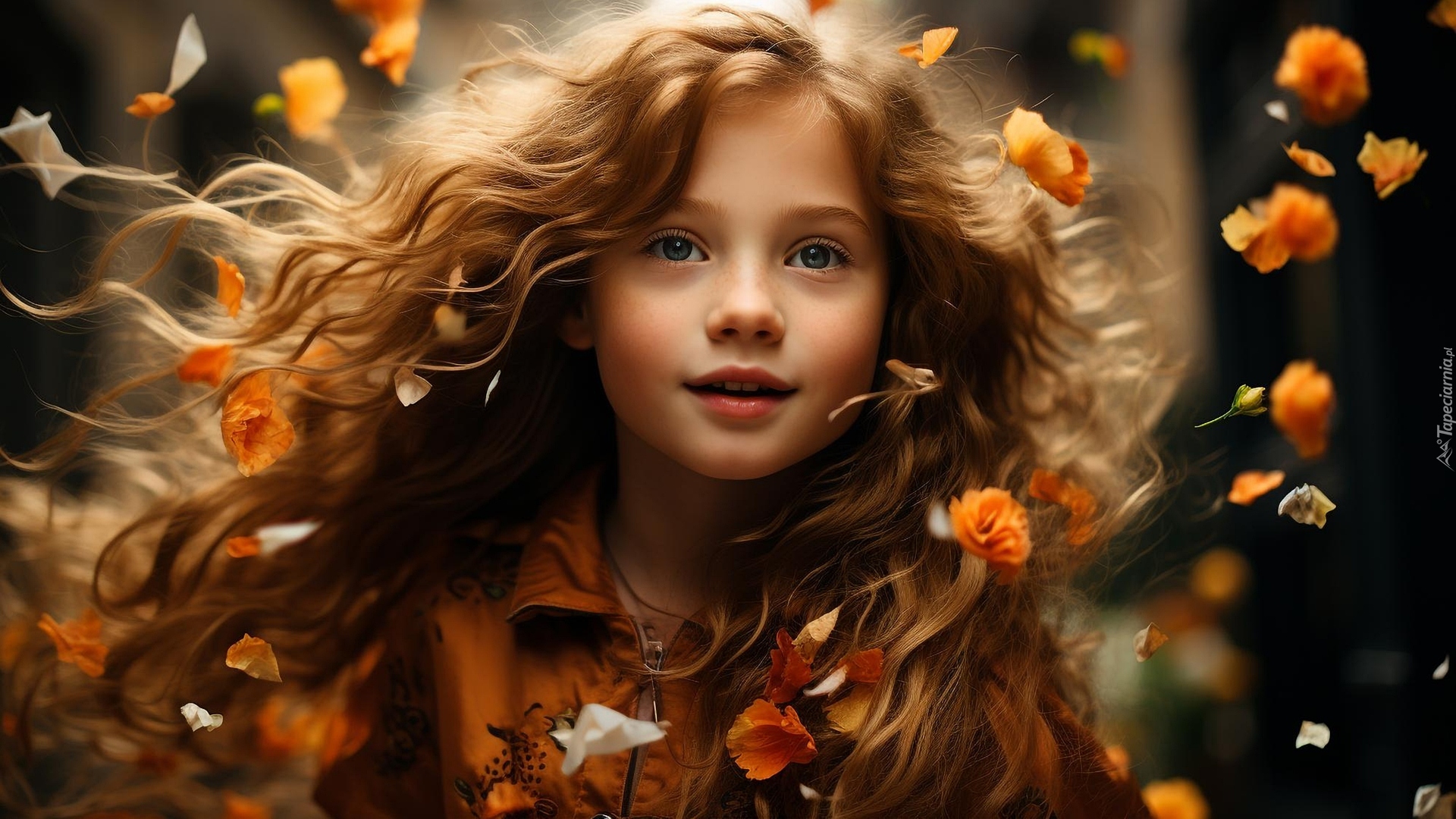 Edytor tapety: Spadające kwiatki na dziewczynkę z rozwianymi włosami