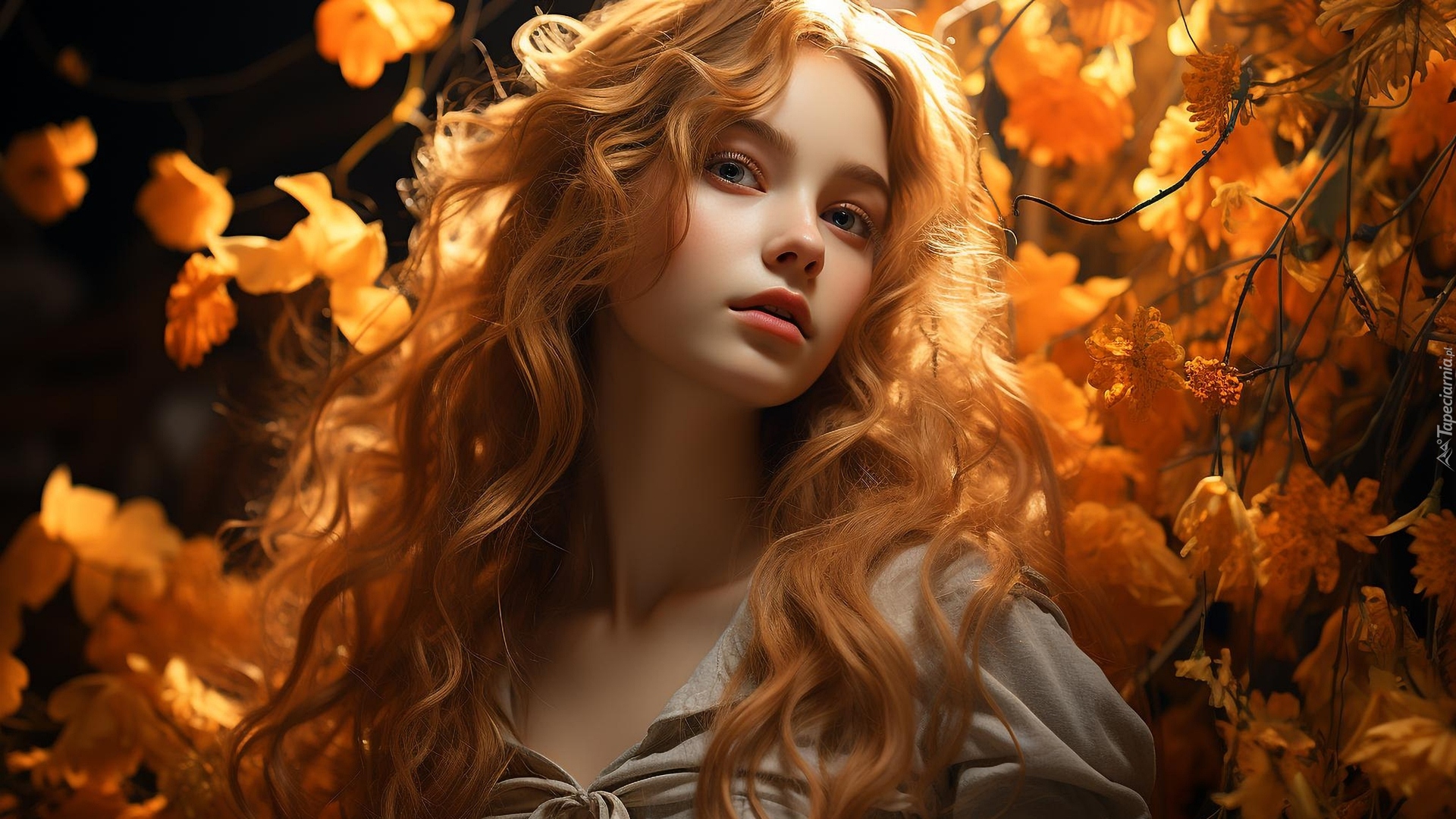 Edytor tapety: Dziewczyna z długimi rudymi włosami pod pożółkłym krzewem