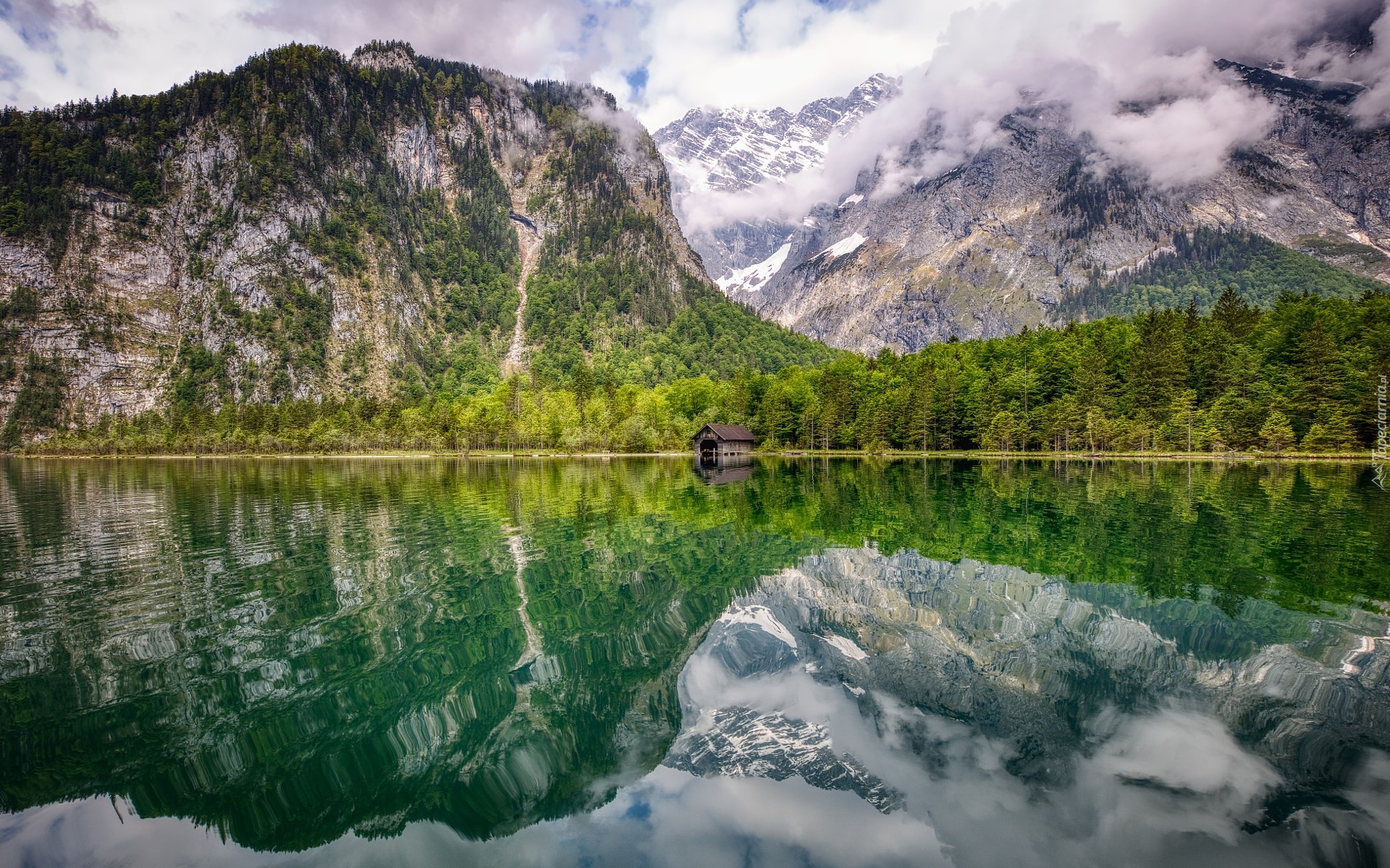 Edytor tapety: Hangar na łodzie pod drzewami nad jeziorem Konigssee