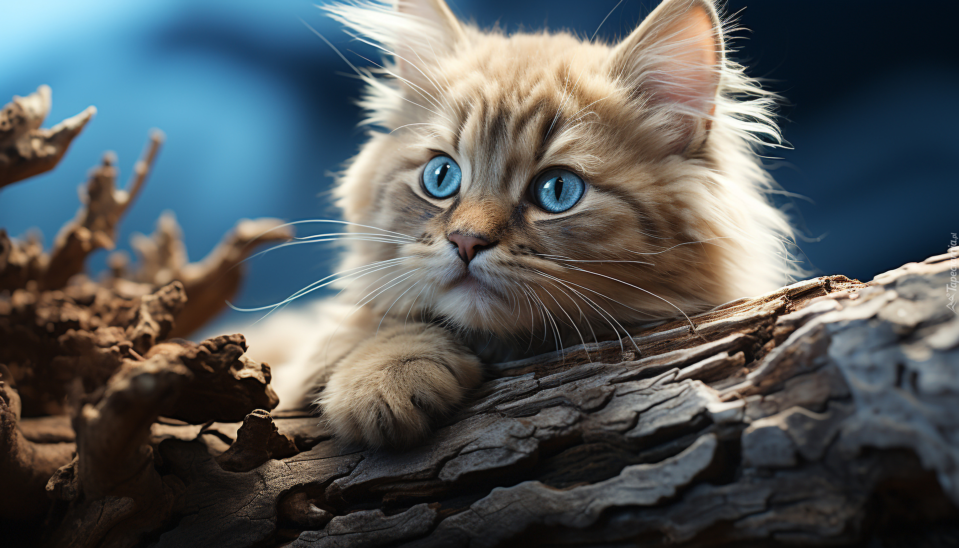 Edytor tapety: Mały niebieskooki kot na suchym konarze