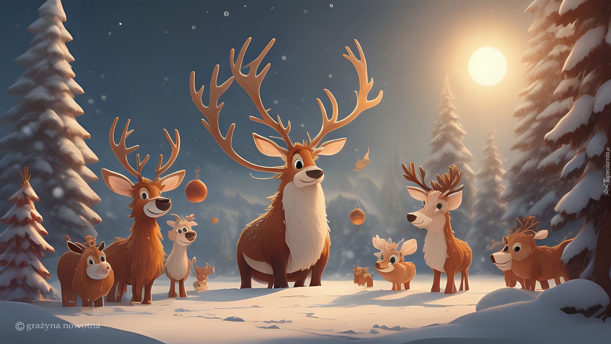 Edytor tapety: Renifery na śniegu w lesie w grafice