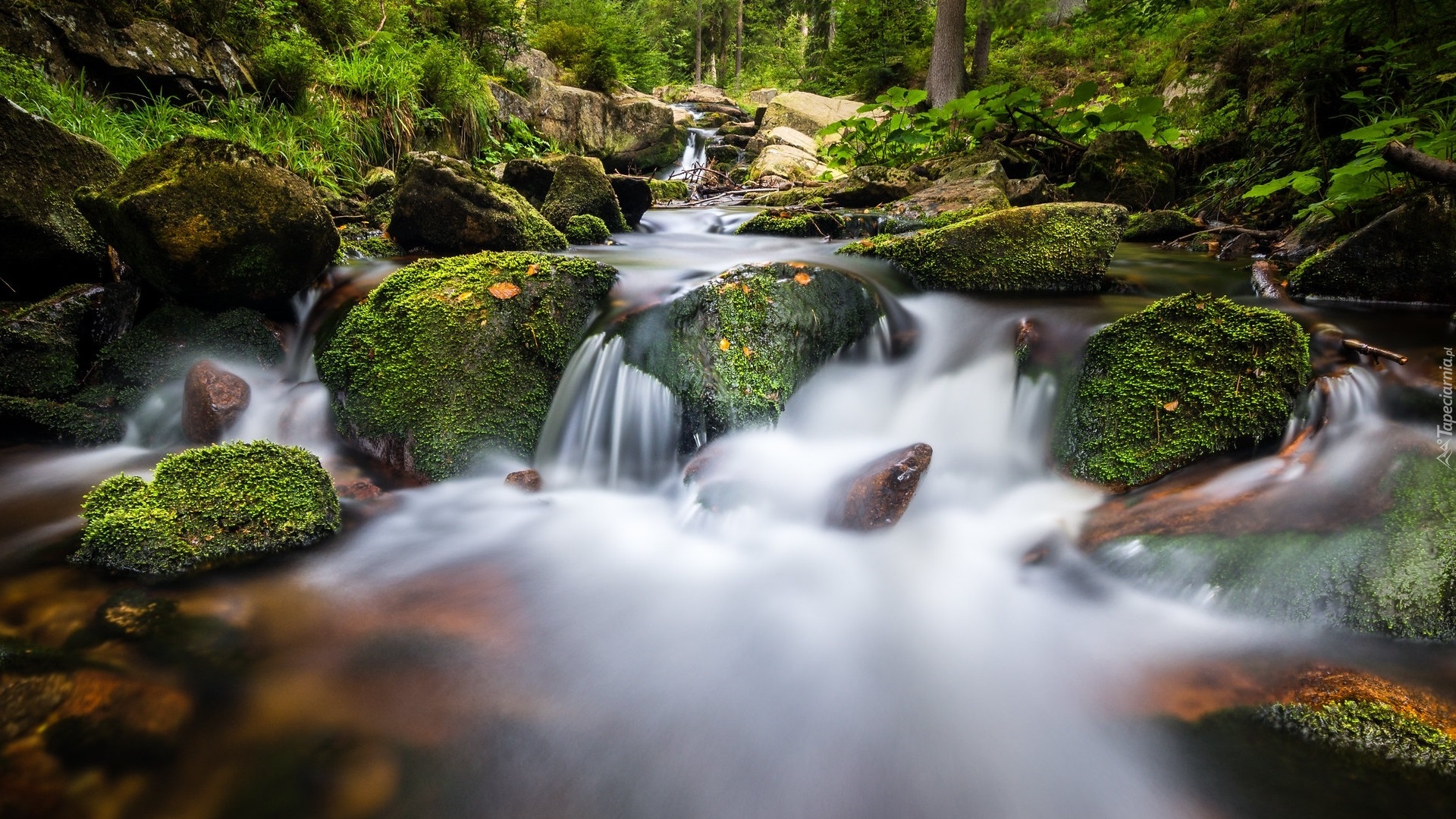 Edytor tapety: Omszałe głazy na leśnym potoku