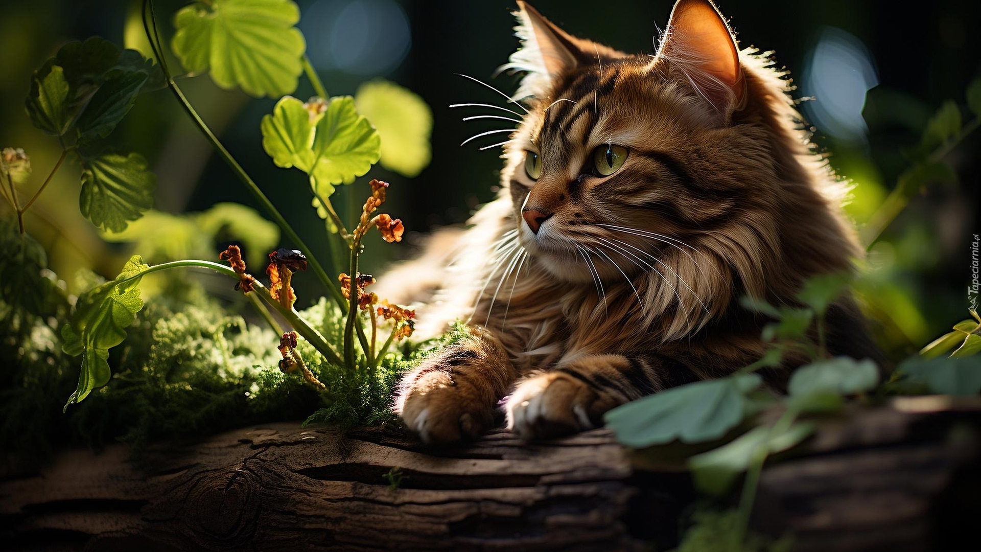 Edytor tapety: Rudawy kot w słonecznym blasku wśród roślin